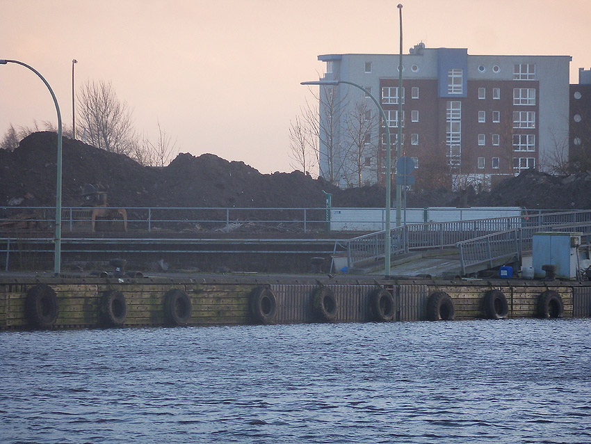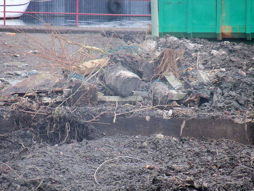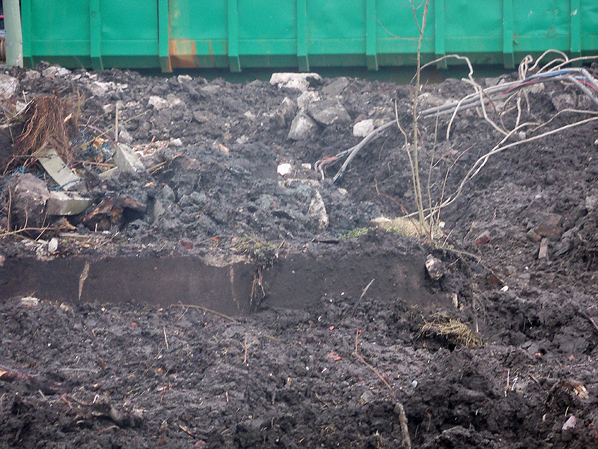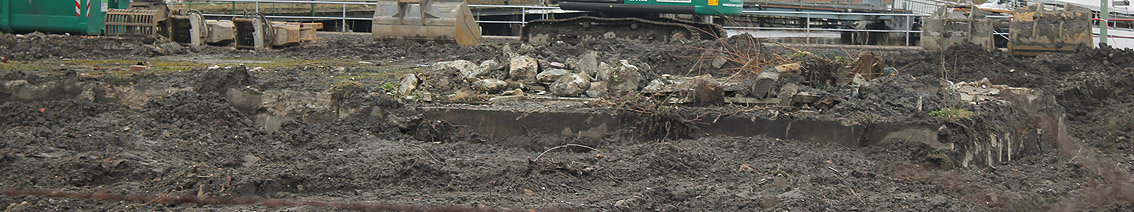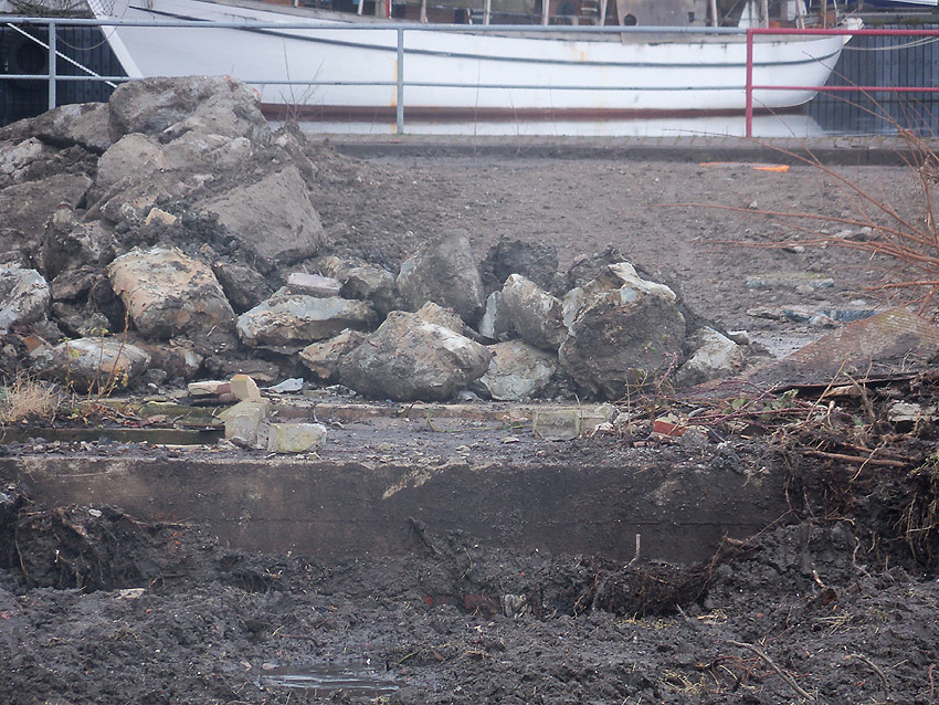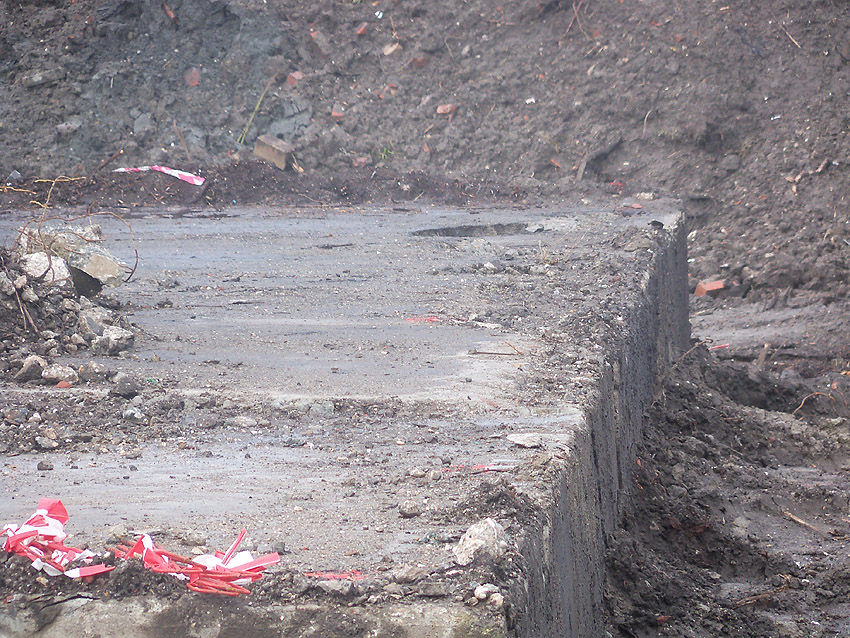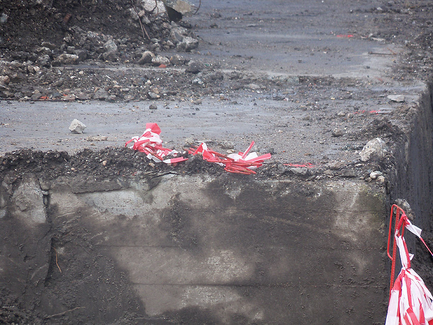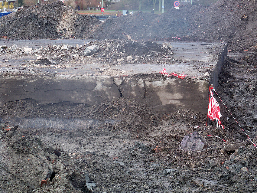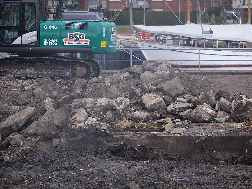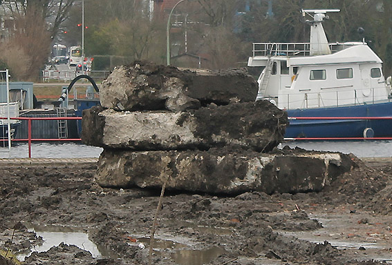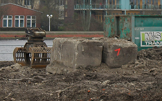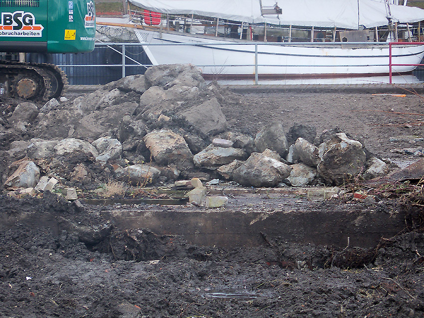 Nachtrag 14. Februar 2018 zum Objekt 2: Das westliche beider "Quadrate" bestand aus zwei nebeneinander gesetzten massiven 3,50 Meter tiefen Betonquadern (unbewehrt). Der Bereich wurde am 7., 8. und 9. Februar 2018 abgebrochen. Eventuell handelte es sich dabei um eine Art Fundament für einen Lastenkran. Vielleicht sogar um eine Art Schwerbelastungs-Testkörper?