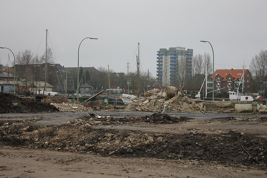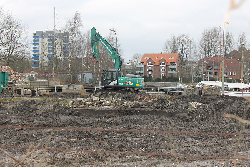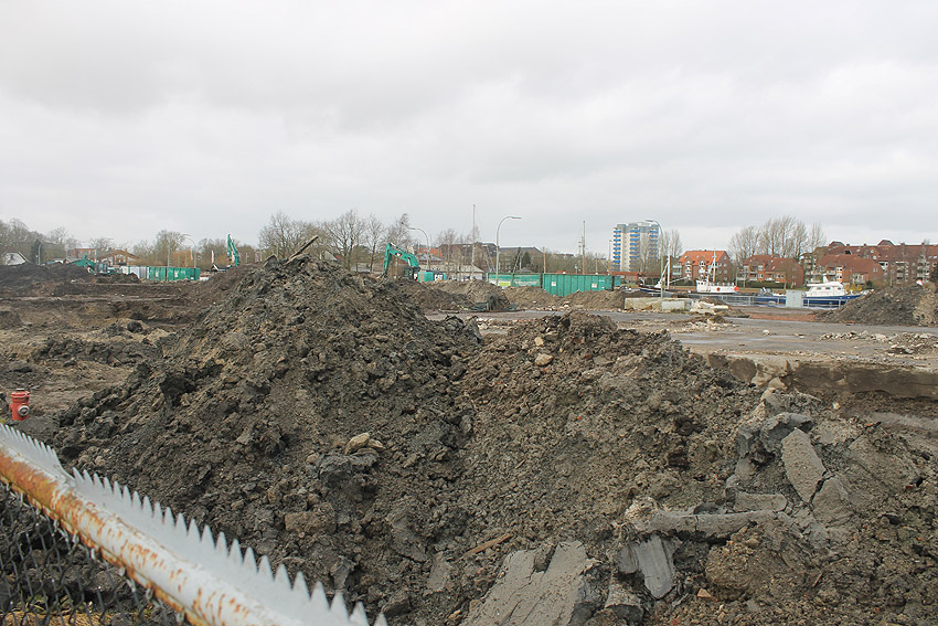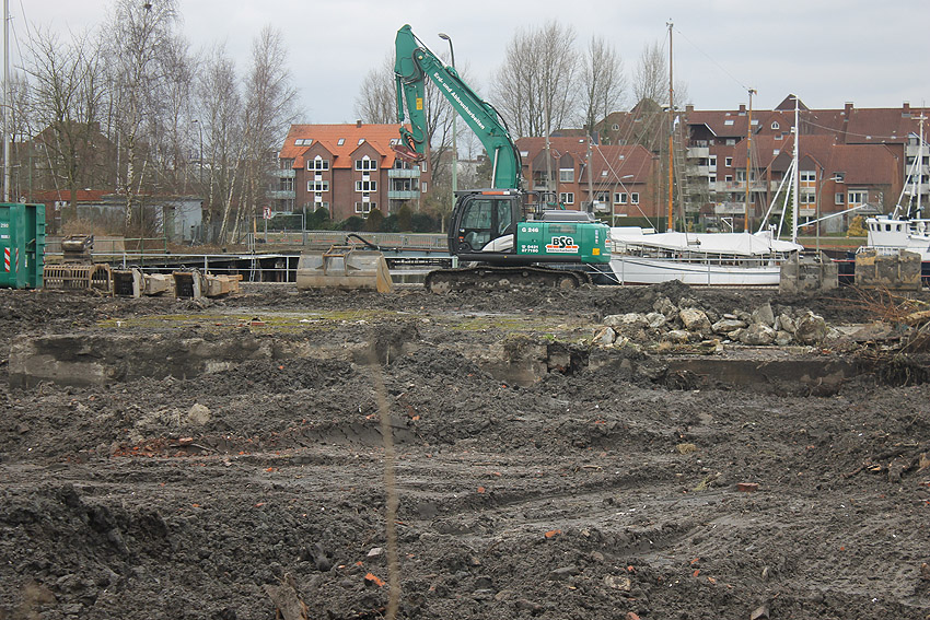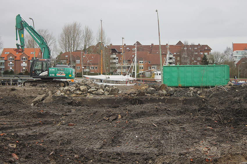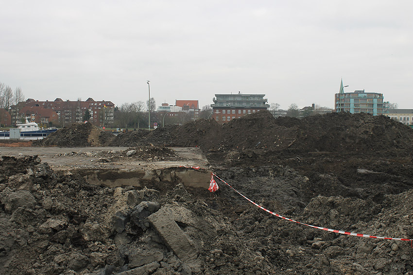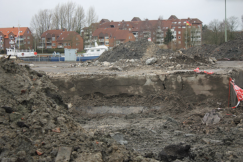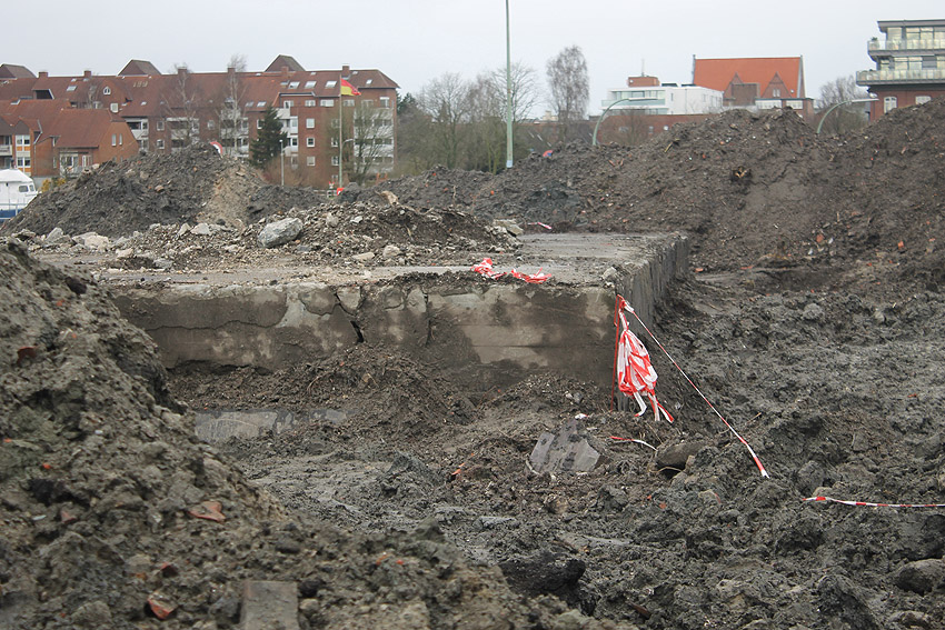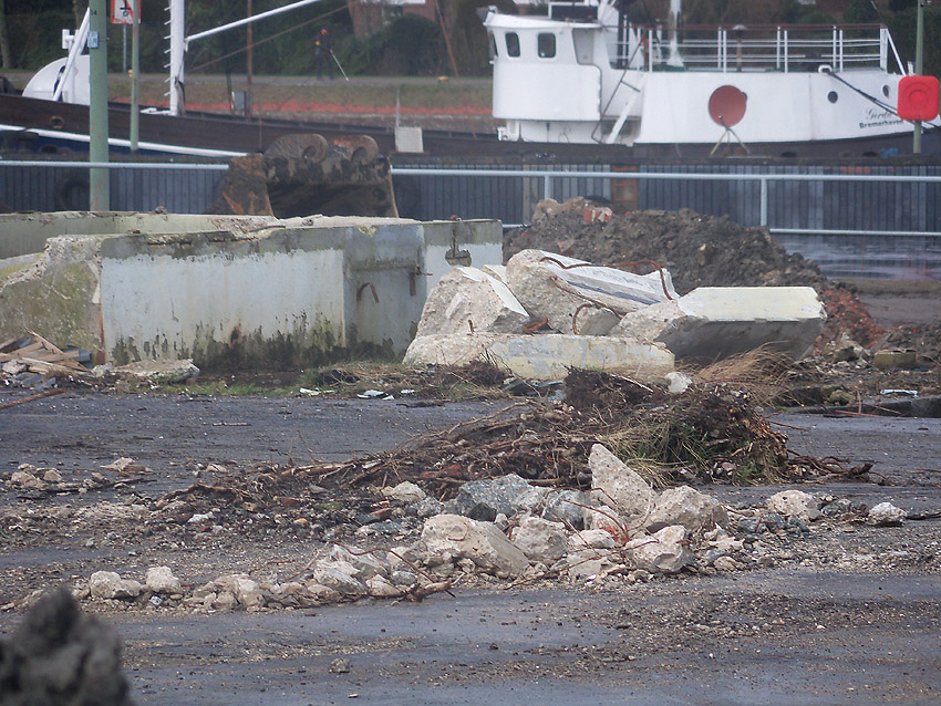 Überall auf dem Gelände häufen sich nun ans Tageslicht beförderte massive Betontrümmer und Quader (eventuell Gewichte für Bojenfestmachungen auf See). Der Tiefbunker wurde weiter freigelegt. Momentan ist der Kampfmittelräumdienst vor Ort. In Kürze dürfte eventuell damit begonnen werden, den komplett unter Wasser stehenden Tiefbunker zwecks Sondierung teilweise leerzupumpen.