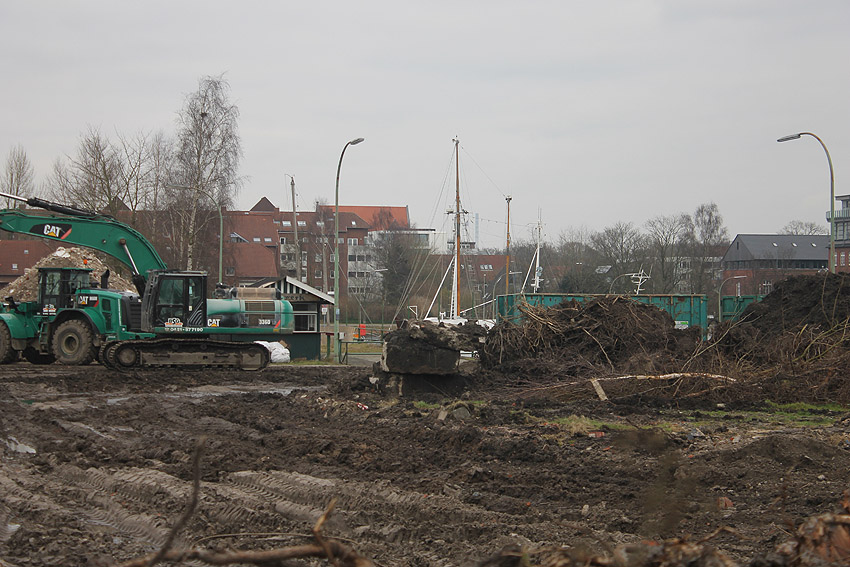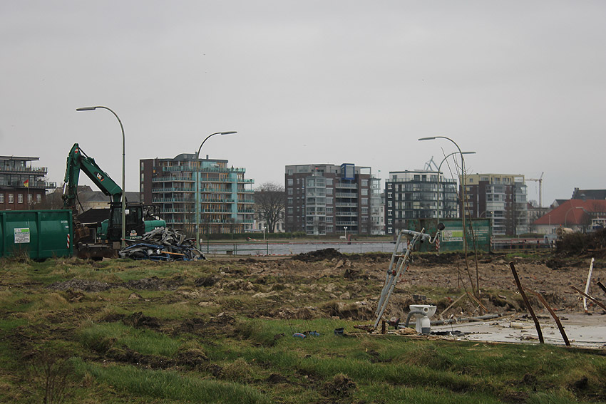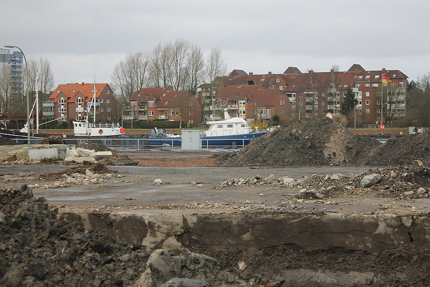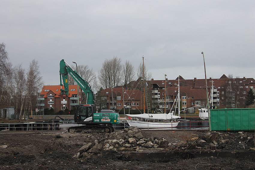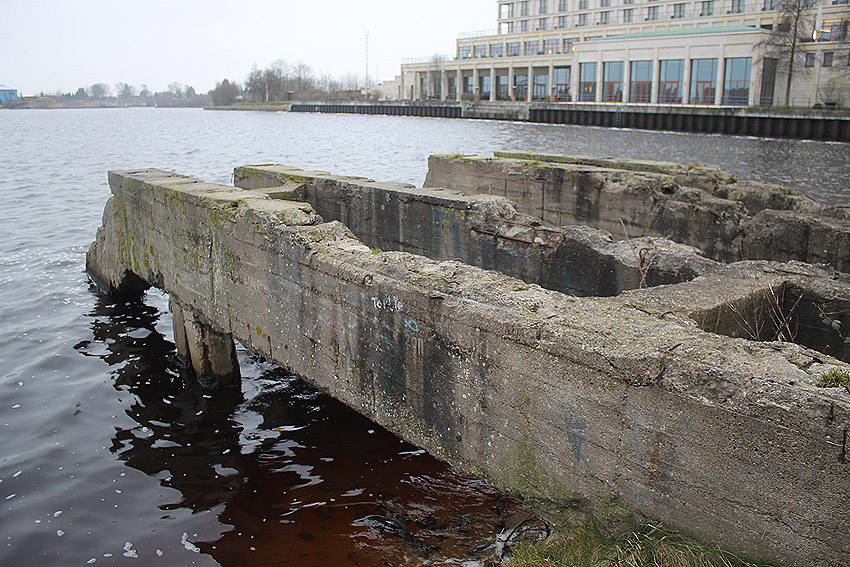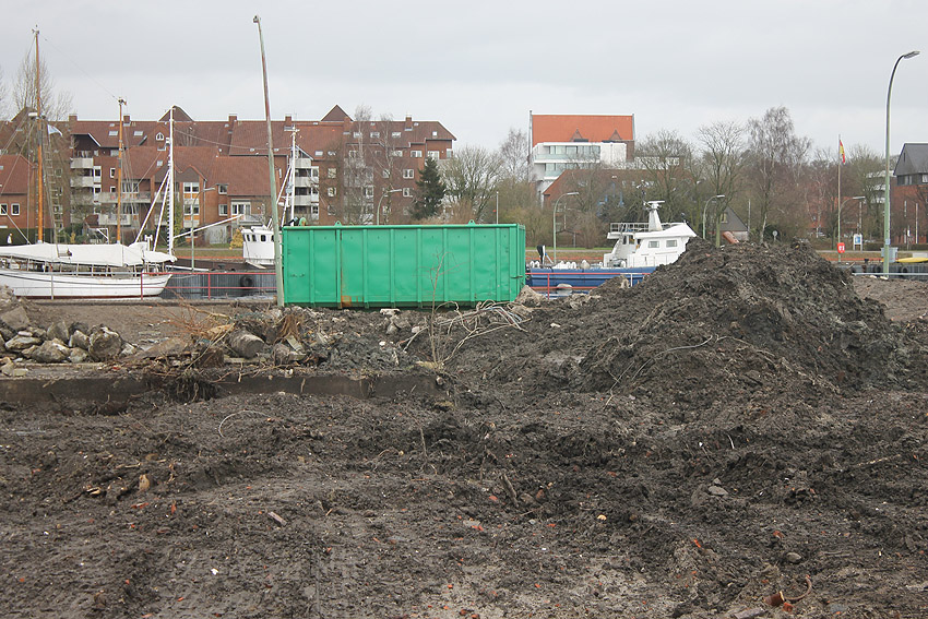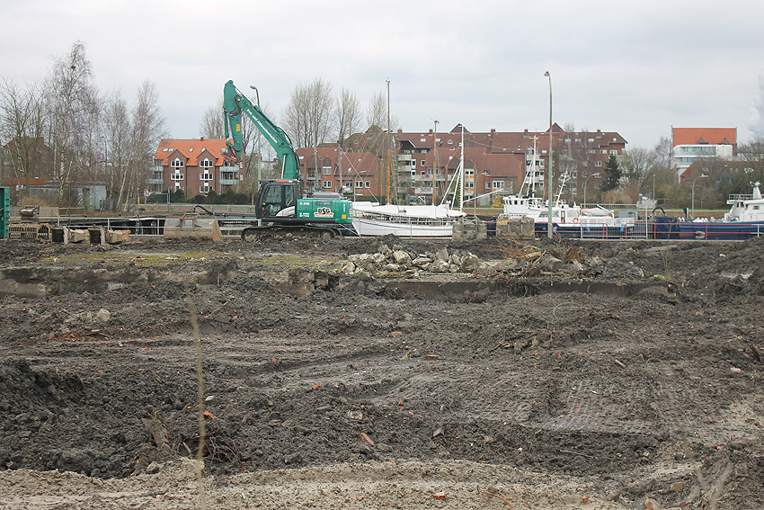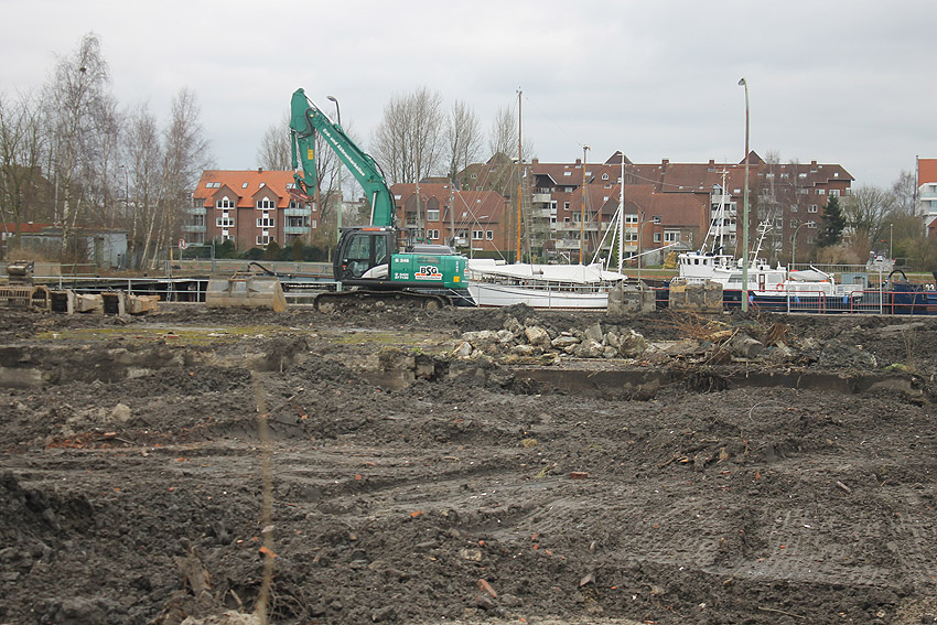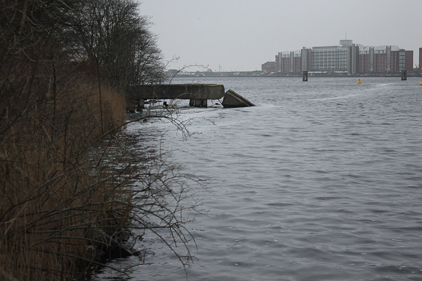 Überall auf dem Gelände häufen sich nun ans Tageslicht beförderte massive Betontrümmer und Quader (eventuell Gewichte für Bojenfestmachungen auf See). Der Tiefbunker wurde weiter freigelegt. Momentan ist der Kampfmittelräumdienst vor Ort. In Kürze dürfte eventuell damit begonnen werden, den komplett unter Wasser stehenden Tiefbunker zwecks Sondierung teilweise leerzupumpen.