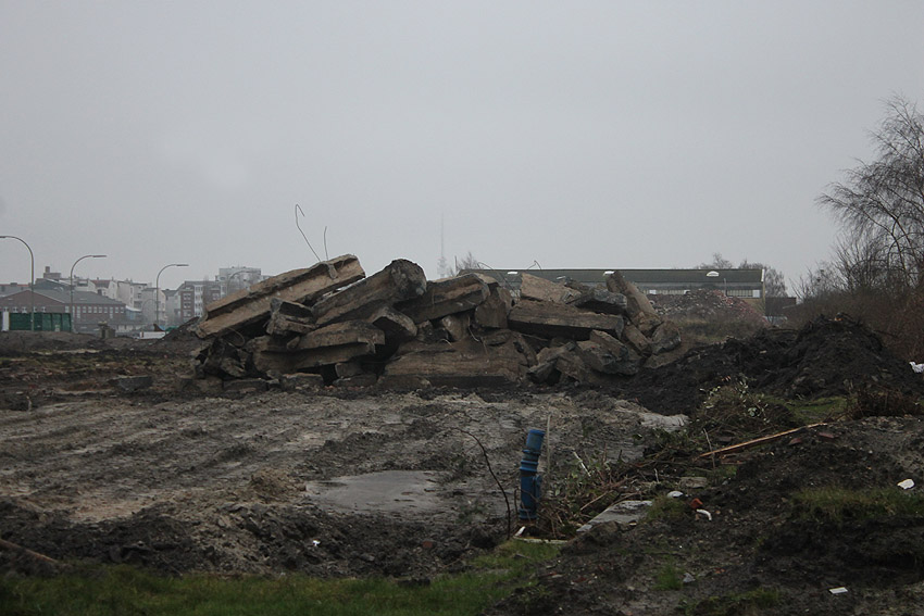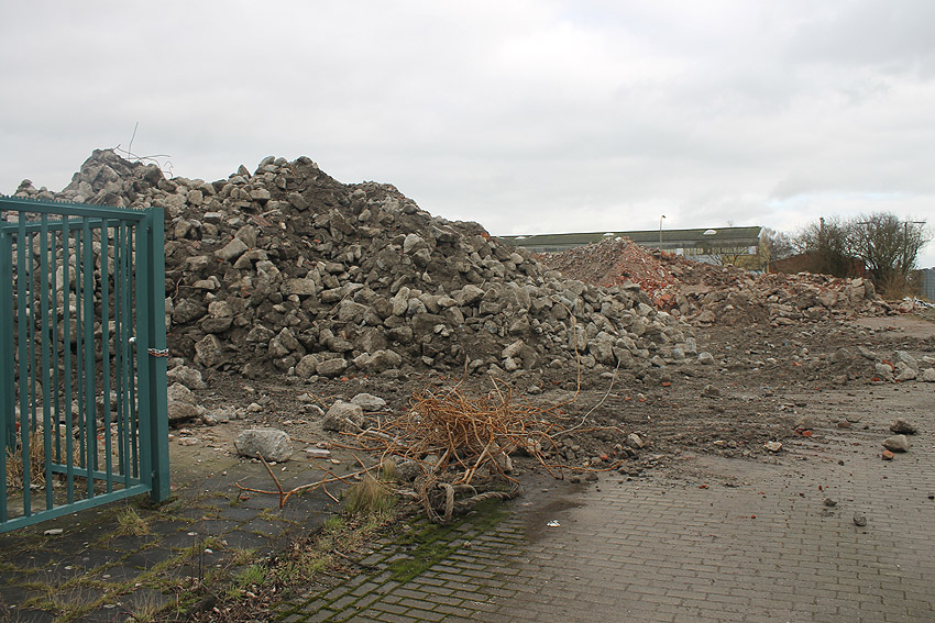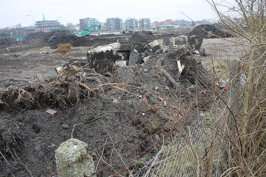 Das am Tiefbunker anliegende Heizwerk-Gebäude wurde bis auf den Schornstein abgerissen. Die Gebäudetrümmer lagern nun zunächst auf der Bunkerdecke.