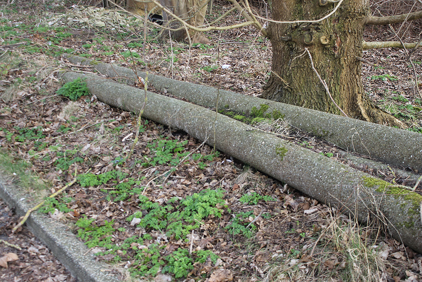 Nachtrag 12.02.18: Das "winkelförmige Massivbetonteil" hat sich nun als zwei nebeneinander liegende betonierte Tanks aus Nachkriegszeiten (BW) herausgestellt. Diese befanden sich ursprünglich unter Erdgleiche. Die beiden seitlich erkennbaren Öffnungen stellen Aufnahmen für Pumpleitungen / Abpumpen / Auffüllen eben dieser Boxen dar.