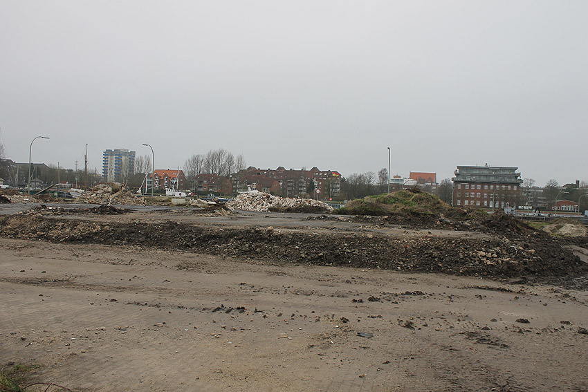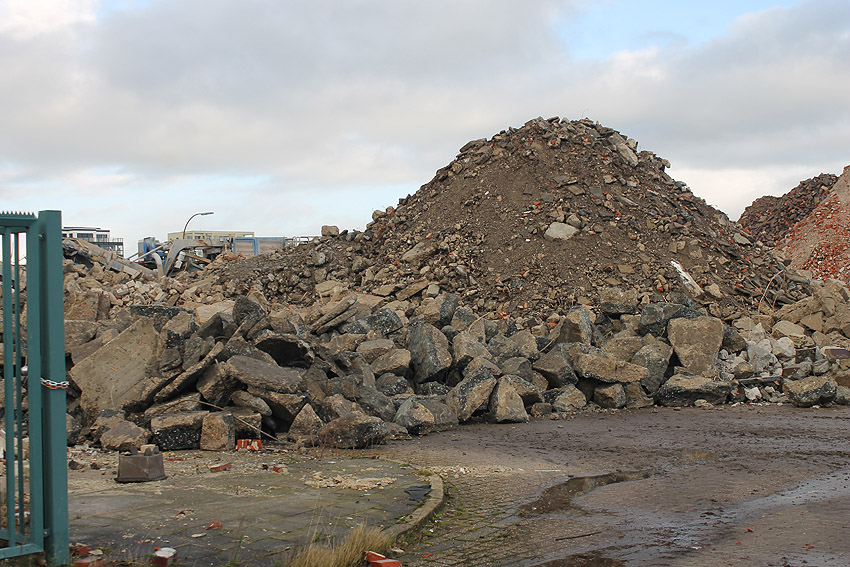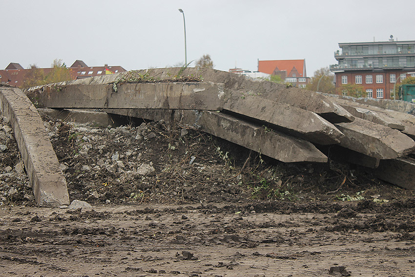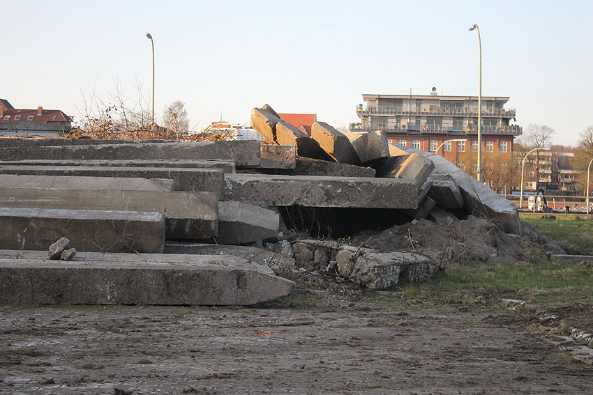 Alles ist abgerissen bis auf den Tiefbunker. Gewaltige Betontrümmer der Nachkriegsbauten-Fundamente türmen sich auf dem Gelände.