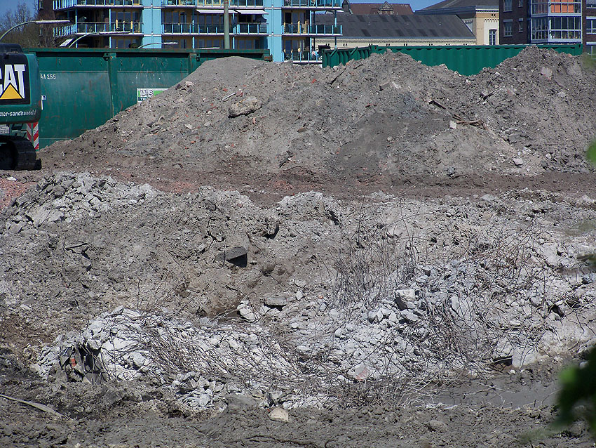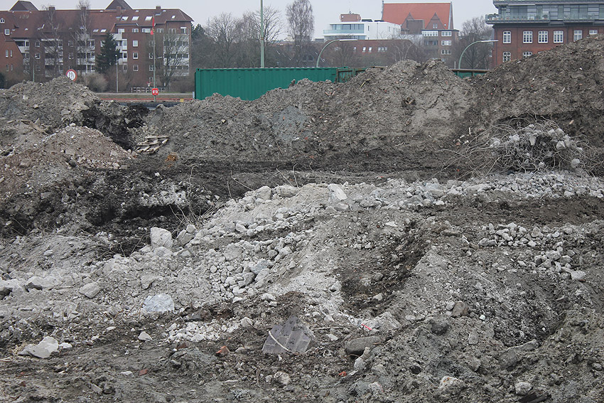 Die Sohlplatte des Tiefbunkers wird weiter abgebrochen. Hinweis: Die vermuteten Kranaufnahmen aus Stahlbeton, welche sich östlich des Bunkers befanden, wurden bereits vor einigen Wochen entfernt. Die Reste der Nordwestwand des Bunkers mit dem letzten "Rauchen verboten"-Schriftzug sind vor knapp zwei Wochen zerkleinert worden.