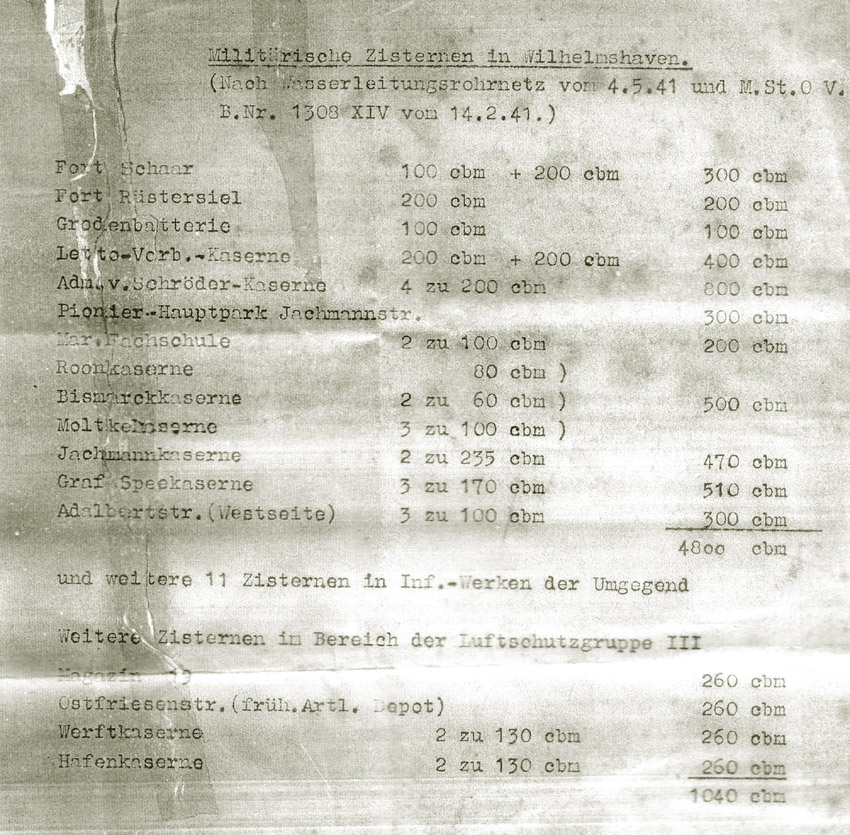 | Gesicherte Löschwasser-Zisterne / Brunnen 7, Admiral von Schröder-Kaserne, Schiffs-Stamm-Division der Nordsee, Kaserne Mühlenweg, im Hof Südlich Block heutige Schellingstraße 15 / wohl im Verbund mit Gebäude 200 Kubikmeter |