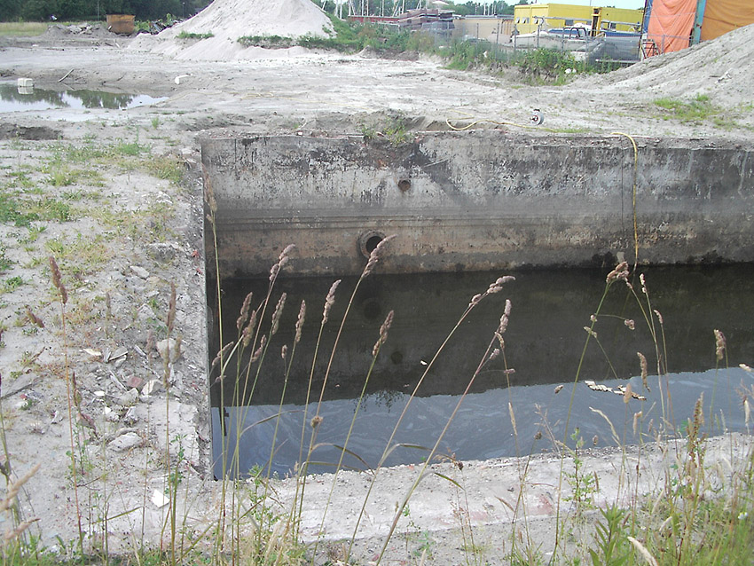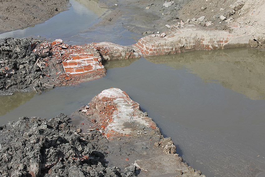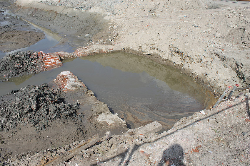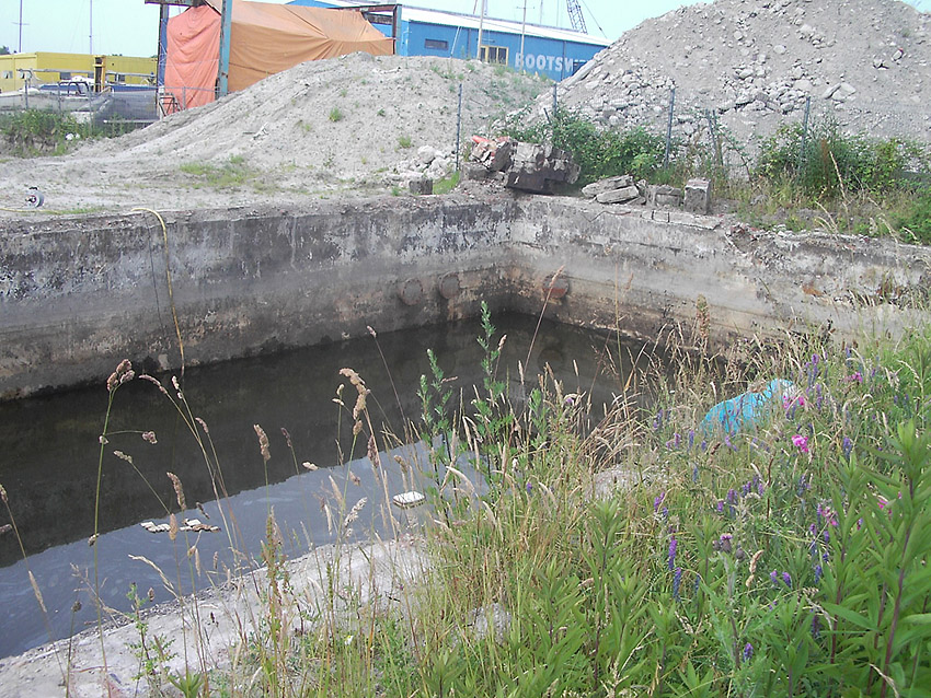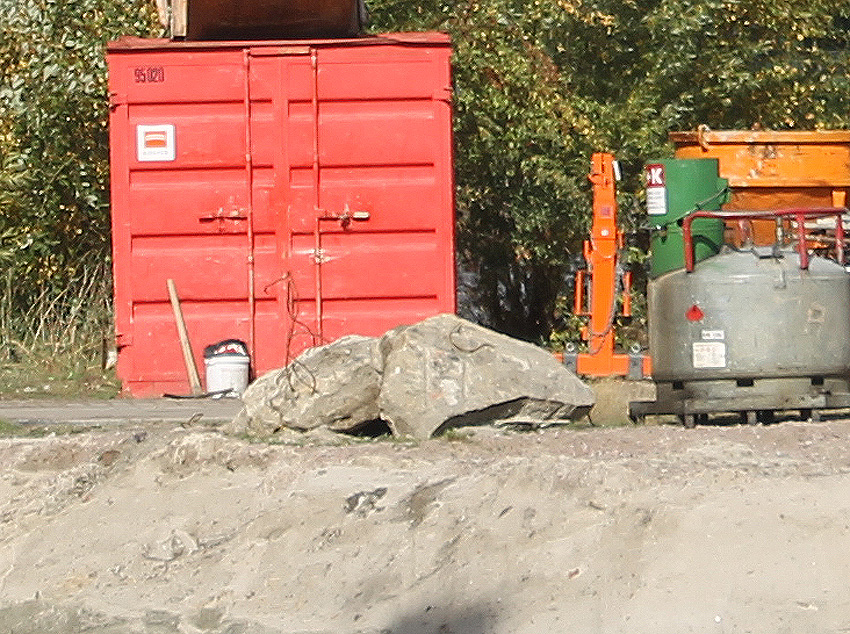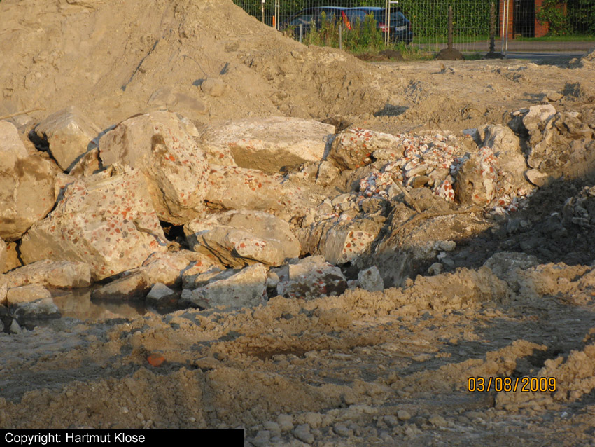 Die Sohle des dortigen ehemaligen Tanks dürfte nicht beseitigt worden sein. Durch die dünne Betonschicht, die nun wieder mit Sand und Schlick überdeckt ist, wird scheinbar hindurchgerammt. Damit endet unsere Dokumentation von dieser Ecke der Stadt.