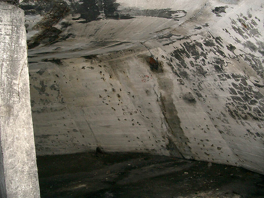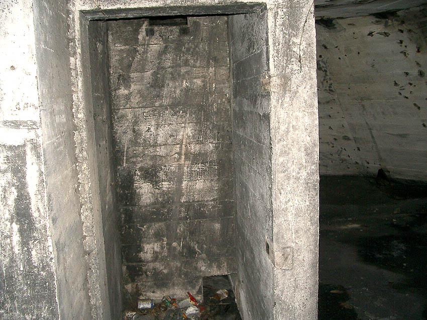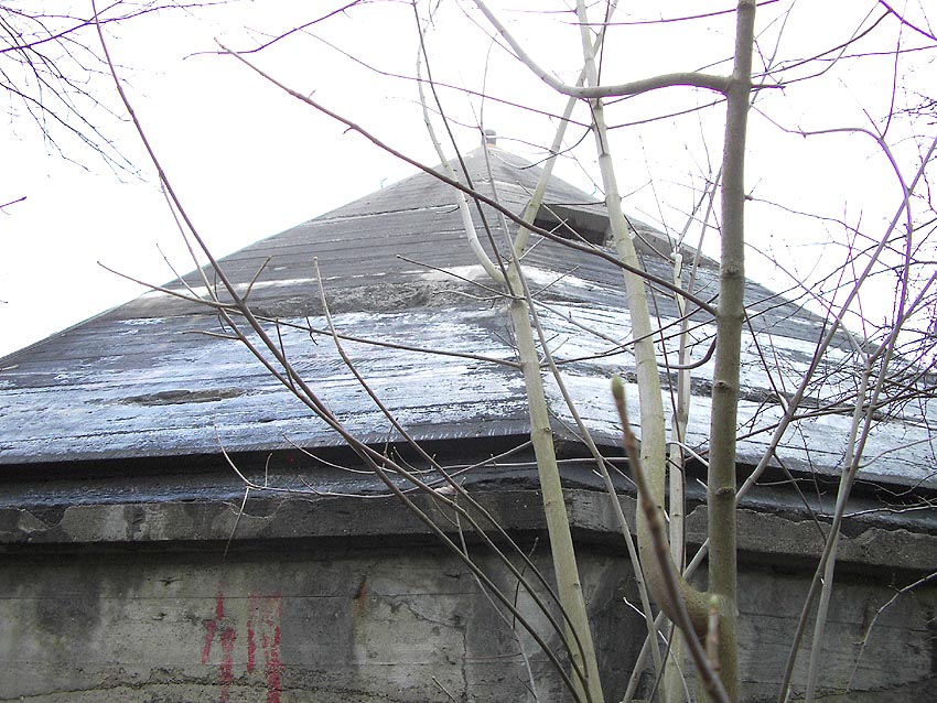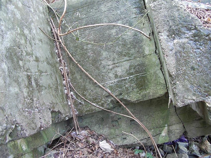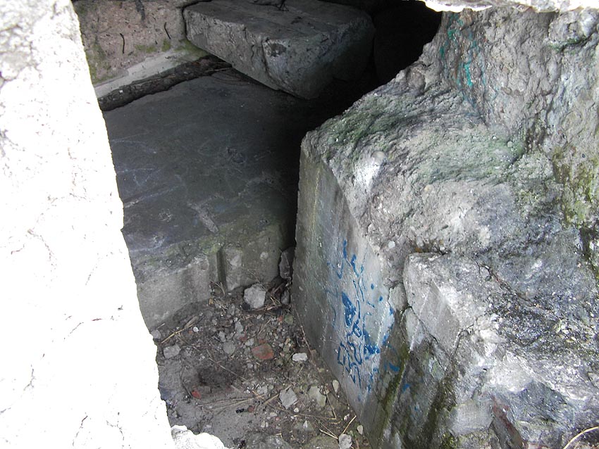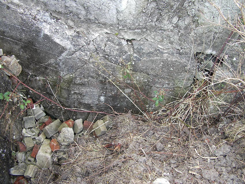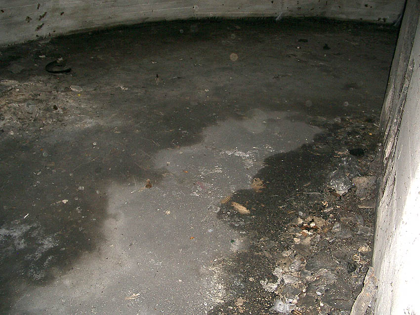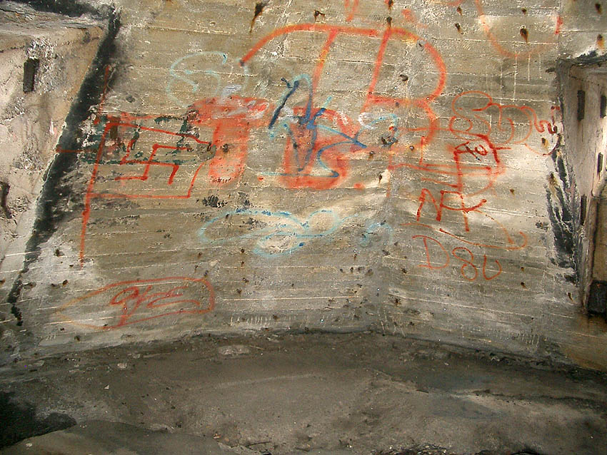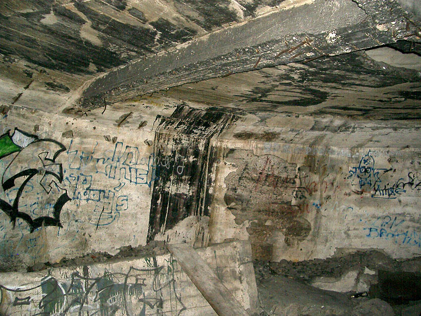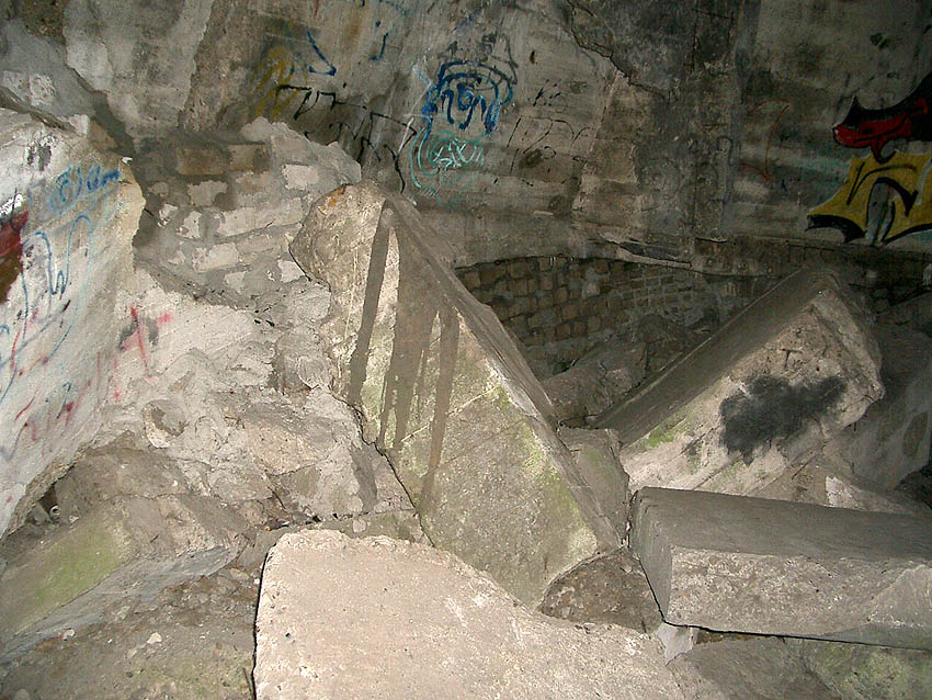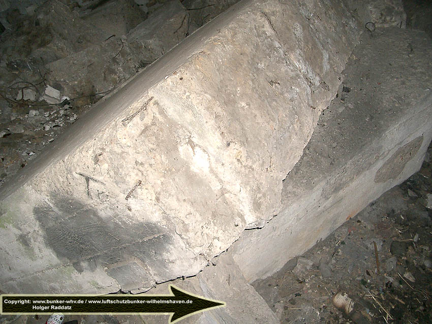Die erste bis sechste Ebene des Turmes könnte mutmaßlich unterschiedlich zum Turm Norderneystraße aufgeteilt gewesen sein. Es könnte sein, dass hier die Ebenen in jeweils vier Raumzellen aufgeteilt gewesen waren. Hier wie auch auf den Fotos weiter oben zu sehen sind mutmaßliche Reste einer Trennwand an der Decke. Es kann aber auch sein, dass dies lediglich Deckenverstärkungsträger waren. Einige glatte Bereiche an den Resten deuten darauf hin...