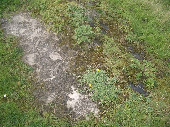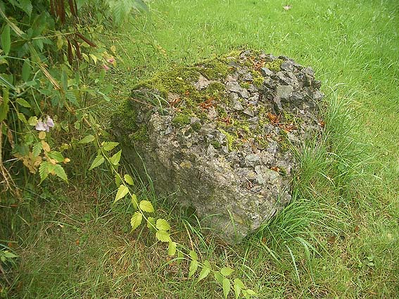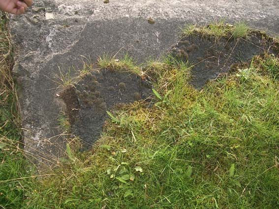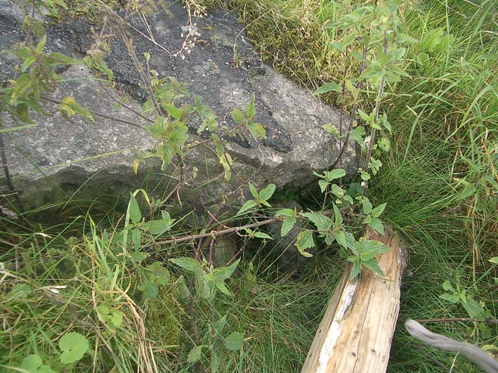 Nur dieser Betonbrocken einige Meter vom Standort entfernt konnte aufgefunden werden. Er scheint durch die Sprengung damals hierhin katapultiert worden zu sein. Natürlich ist es auch denkbar, dass er nachträglich hier abgelegt wurde. Auf jeden Fall wird er jedoch von der Verbunkerung des Infanteriewerkes 2 stammen.