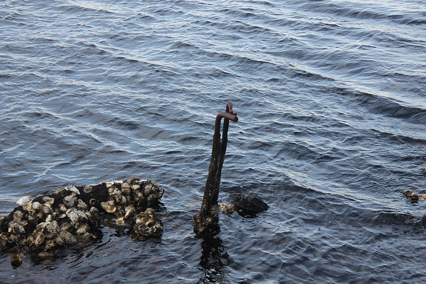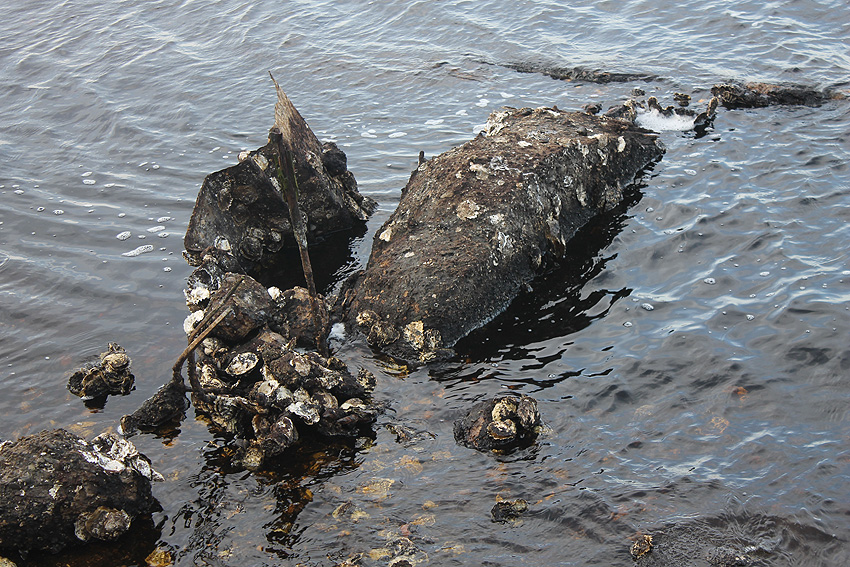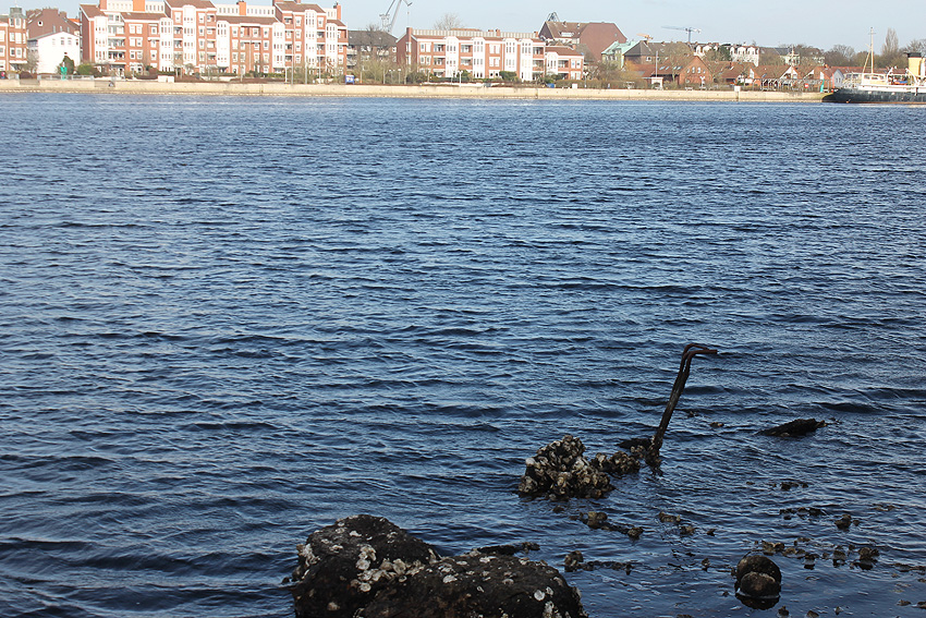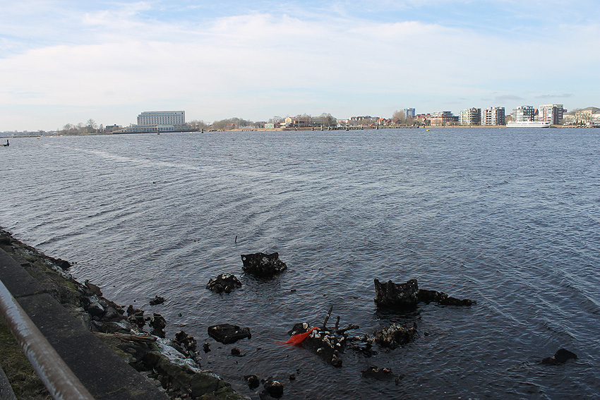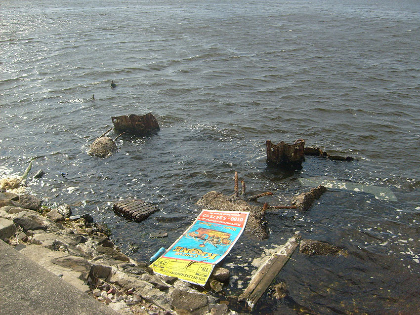 Trümmerstücke der alten Kaimauerbefestigungen / hier war das Westende der 1945 noch existenten Bereiche der Seydlitzbrücke. Eventuell auch einige durch Sprengung hierhin katapultierte Reste vom Bunker, direkt nördlich am Ufer des Hafens. Kurzzeitig im Sommer 2010 erkennbar, da der Hafenwasserstand um circa einen Meter abgesenkt wurde. Leichtsinniges Baden ist hier nicht zu empfehlen...