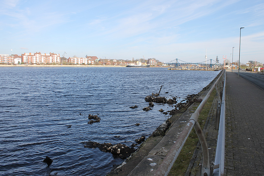 Seydlitzbrücke nördlich des Bunkers: Ursprünglich erstreckte sich die Seydlitzbrücke über den gesamten Südbereich des Hipperhafens in etwa vom West-Bereich des Südanlegers der Grodenfähre bis zum Ost-Bereich "Planschbecken". 1945 waren von den Konstruktionen der Brücke an der Kaimauer über dem Hafenwasser aber nur noch Bereiche mittig-östlich* und ganz westlich Richtung Grodenfähre vorhanden. Siehe dazu folgendes Bild mit "Monte Pascoal".