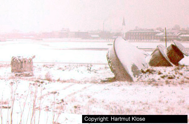 Hinten links hinter dem U-Boot das Heck vom Kriegsmarine-Wohnschiff "Monte Pascoal". Am 3. Februar 1944 war es durch einen Bombenangriff wohl nahe des Truppenbunkers "Banter Ruine" auf Hafengrund gesunken, konnte aber im Mai 1944 wieder schwimmfähig gemacht werden und wurde hierhin an die Reste der Seydlitzbrücke verlegt. Vorn am Boot der noch intakte Westbereich der Seydlitzbrücke. Nach dem Krieg wurde das Schiff an Großbritannien ausgeliefert / abgeliefert und schließlich Silvester 1945 im Skagerrak versenkt.