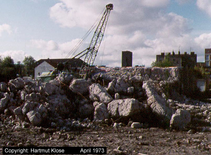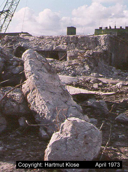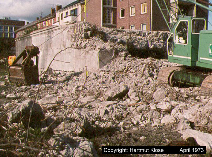 Anmerkung: Eine Aufnahme mit Blick von der Bremer Straße aus dem Oktober 1975 zeigt das für das Neubauvorhaben / Stadthalle planierte Gelände. Auch der Bunker scheint ansatzweise erkennbar. Da nach der Angabe von Herrn Klose dieser aber bereits im April 1973 abgerissen wurde, dürfte es sich dabei um die dann bereits dorthin gesetzte Garage handeln. Siehe Bild unten. Oder aber die Angabe stimmt wider Erwarten nicht, was unwahrscheinlich ist, und der Bunker wurde erst kurz nach der Fertigung des Fotos von 1975 abgerissen.