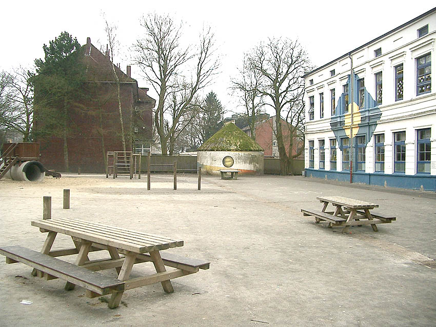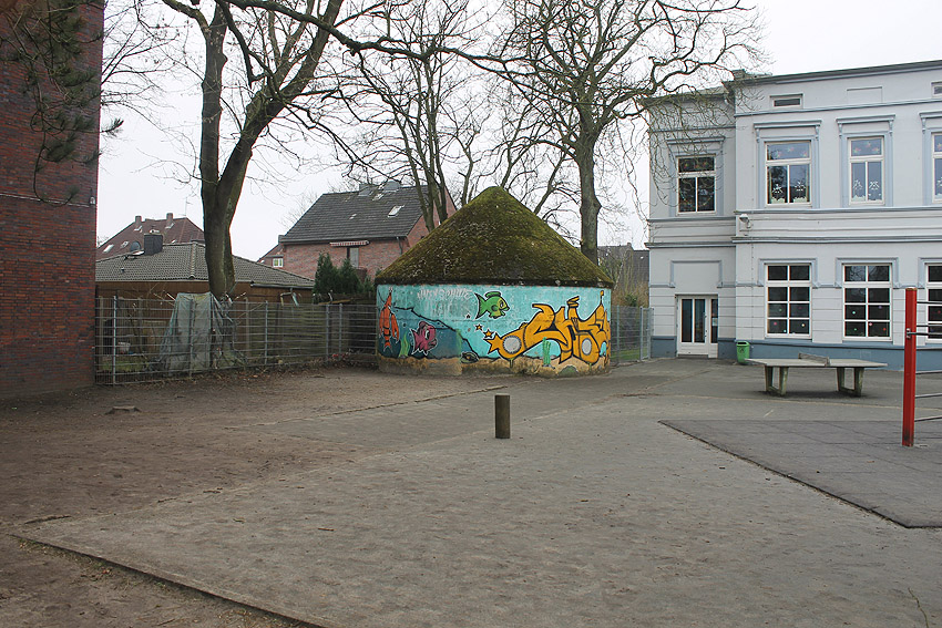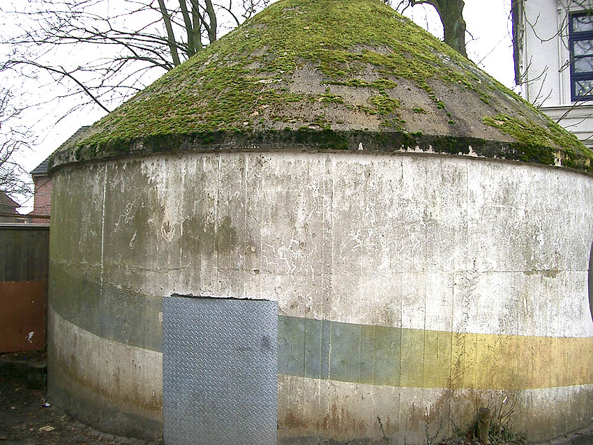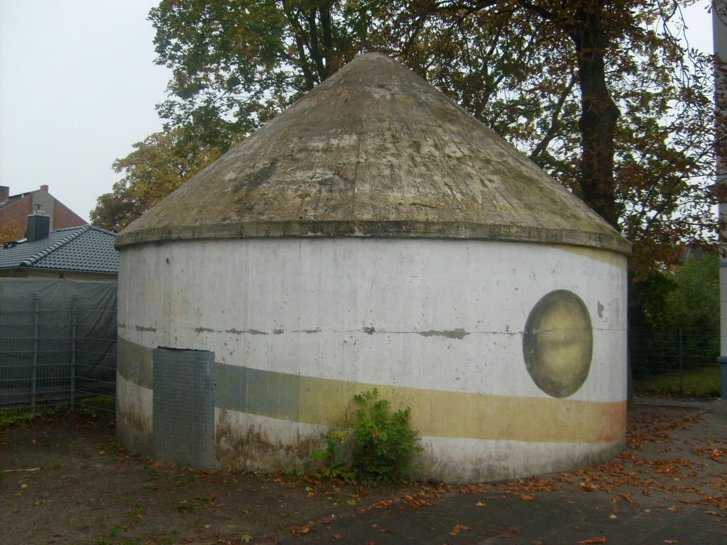 Wie auch beim baugleichen Rundbunker auf dem Schulhof der Franziskusschule ist zu sehen, dass der Haupteingang stets vom Gebäude weg zeigte. Im Falle einer Zertrümmerung des Gebäudes durch Bombentreffer sollte der Zugang keinesfalls verschüttet werden.