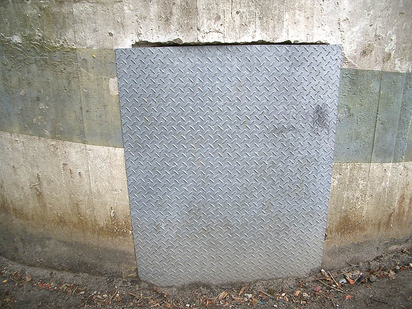 Bild oben: Interessant ist das Objekt rechts der Tür. Es hat ungefähr die Größe des rückwärtigen Notausstieges. Gab es hier vielleicht keinen Betonblock darin, sondern eine Stahlklappe davor (innen und außen)? Ist diese (dann wohl äußere Klappe) hier zu sehen?