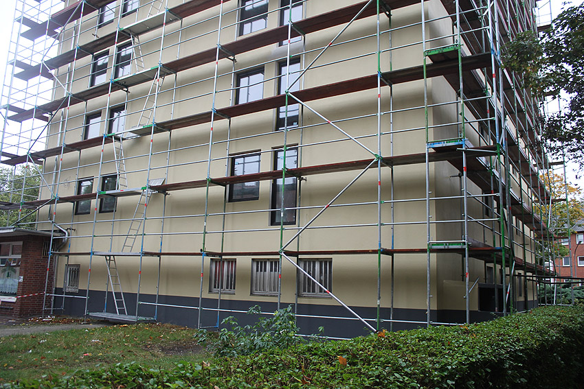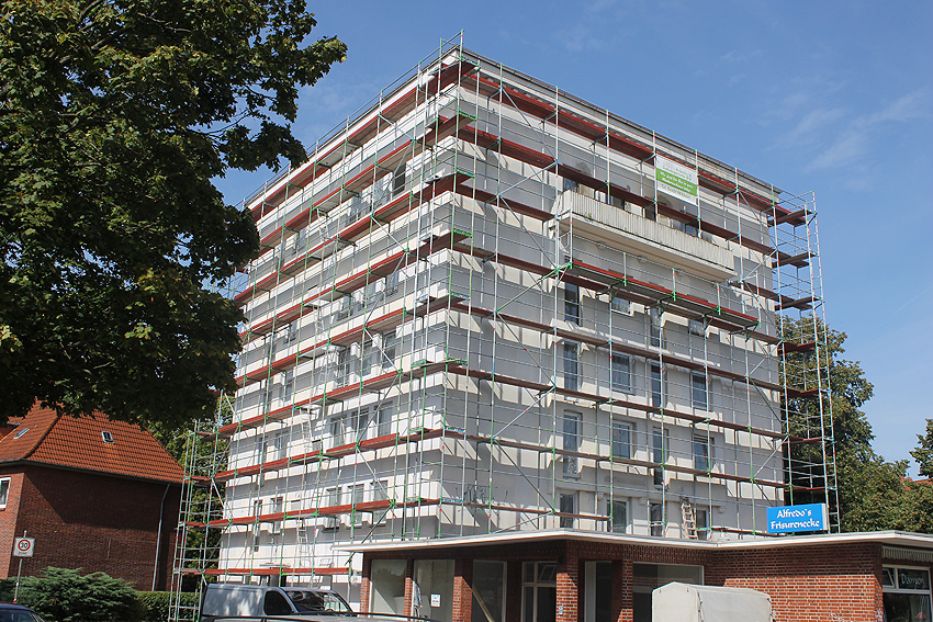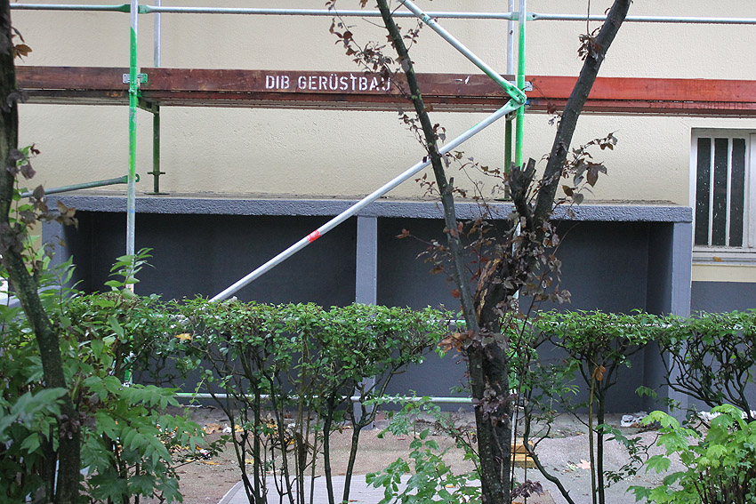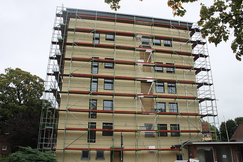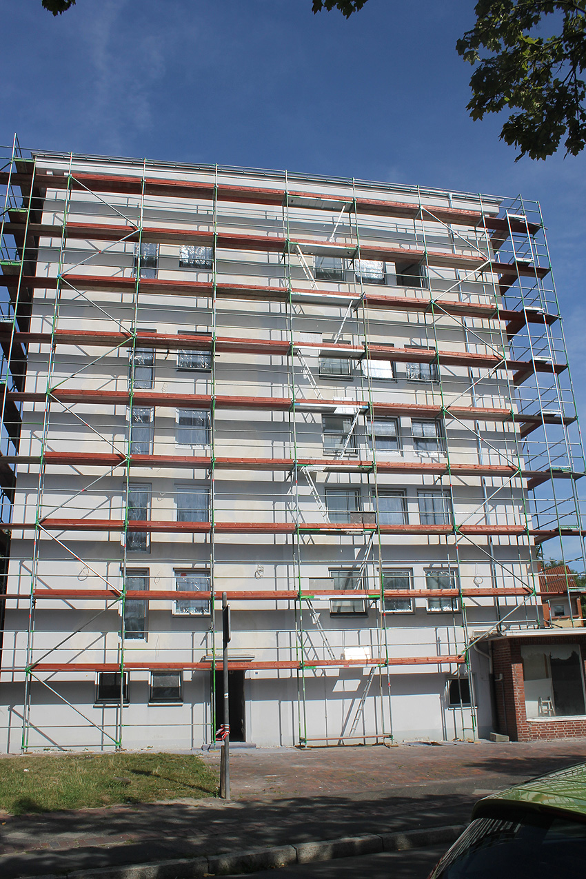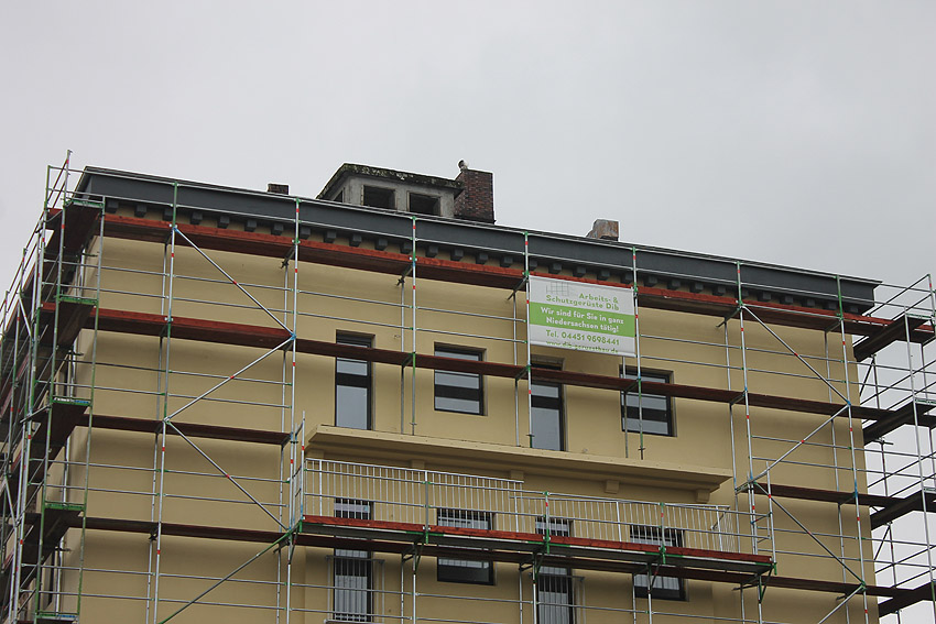 30. August 2019: Es tut sich nun wieder was. Der gesamte Bunker ist eingerüstet und Fassadenarbeiten schreiten voran.