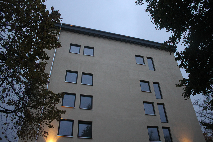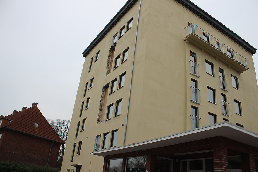 5. Oktober 2019: Die Fassade des Bunkers ist nun komplett neu gestrichen worden. Nachfolgend wird die Installation der Geländer vor die neu geschaffenen Türen erfolgen. An der Südwand beginnt die Maßnahme bereits. Balkone werden nicht angebracht.