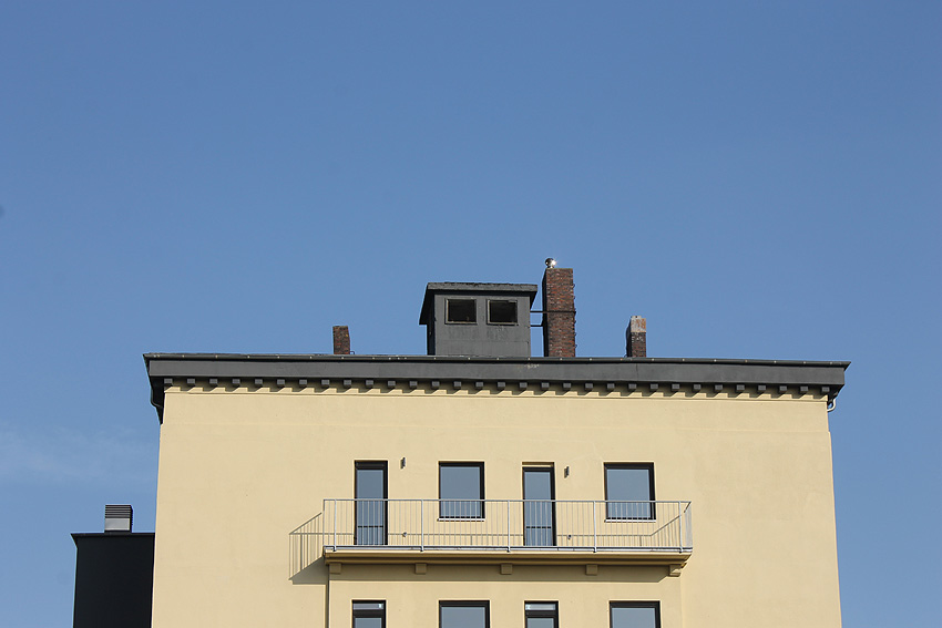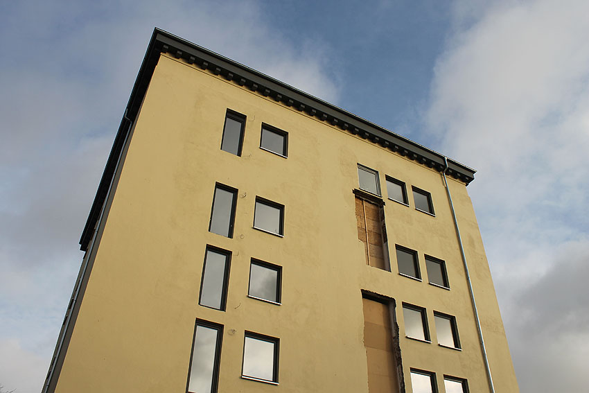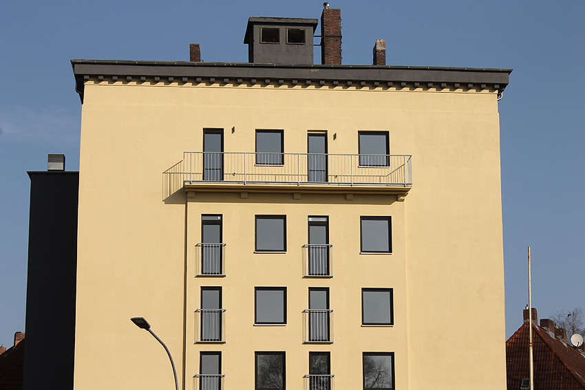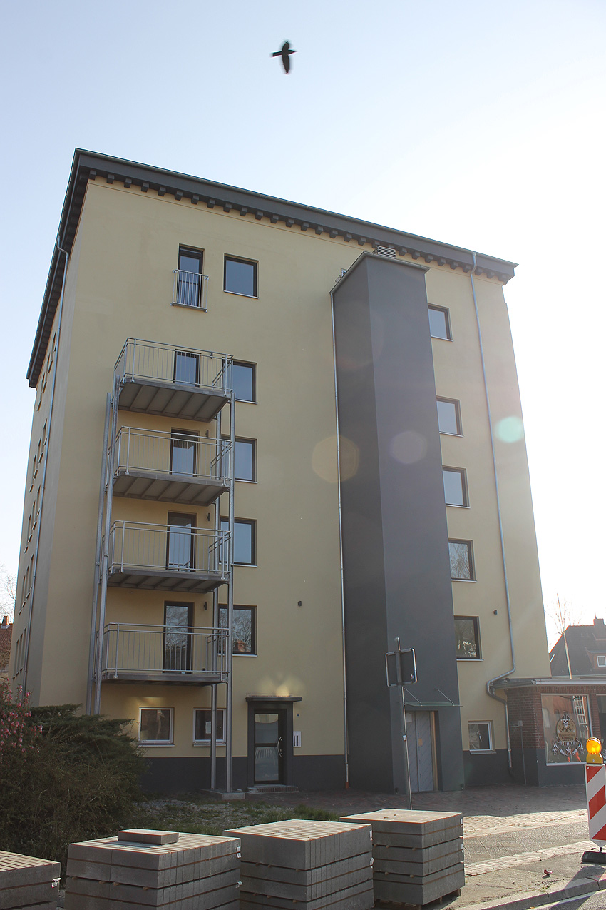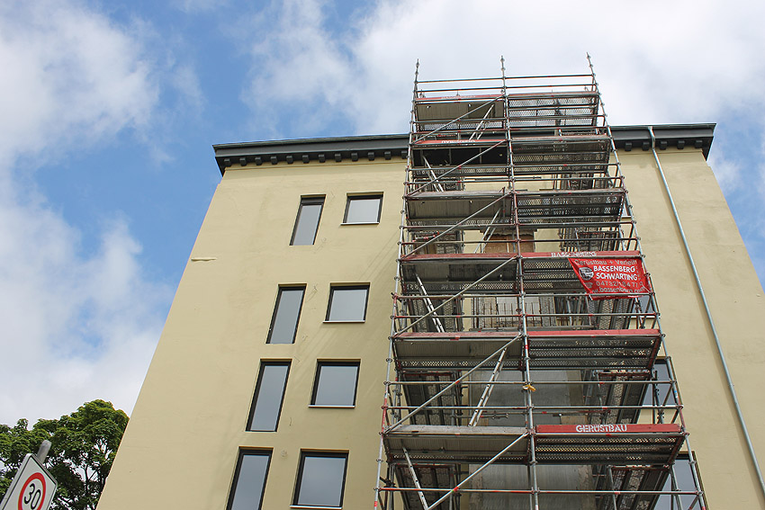29. Mai 2021: Der heutige Stand. Nun werden doch "vollwertige" Balkone (wohl) an der West- und (auf jeden Fall) an der Ostseite des ehemaligen Luftschutzturmes installiert. Der Anbau an der Westwand dürfte einen Aufzugs- oder Treppenhausturm in Fertigung darstellen.