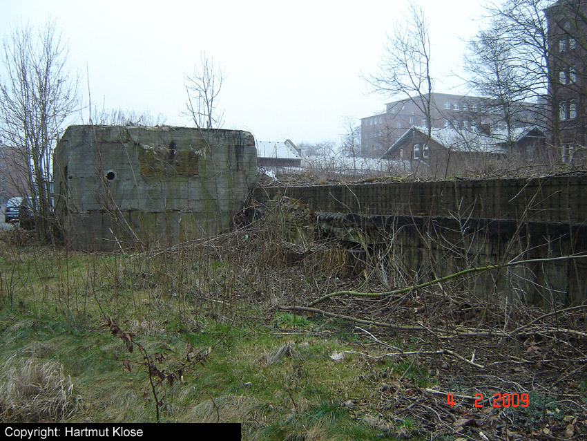 Teilbereiche der alten Werftmauer mussten aufgrund Baufälligkeit mittlerweile entfernt werden. Nun ist der Südostbereich des Bunkers von der Straße aus gut zu erkennen. Am dortigen Eingang hängt seit längerer Zeit (mindestens seit 2004) ein BW-Tarnnetz: