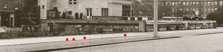 Der durchaus massiv verbunkerte LS-Keller des im Krieg zerbombten Hotels "Loheyde" war das einzige, was von dem Gebäude in der frühen Nachkriegszeit nach der Trümmerräumung noch übrig war. Der Keller besaß Stahlklappen vor den Fenstern und mindestens zwei Splitterschutzvorbauten an den straßenseitigen Notausstiegen. Im unteren Bild über den roten Punkten sind mindestens vier LS-Keller-Luftschächte zu sehen. Rechts Kellerfenster, die hinteren vermauert, links ein Zugang.