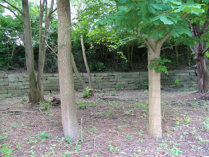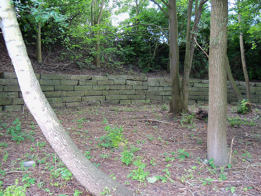 Dies ist der ungefähre Standort heute. Hinter dieser geschwungenen Steinmauer im Bereich des nach der Beseitigung des Manteuffelplatzes aufgeschütteten Erdwalls befand sich der Bunker. Eventuell könnten im Wall noch einige Trümmer des Objektes vorhanden sein...