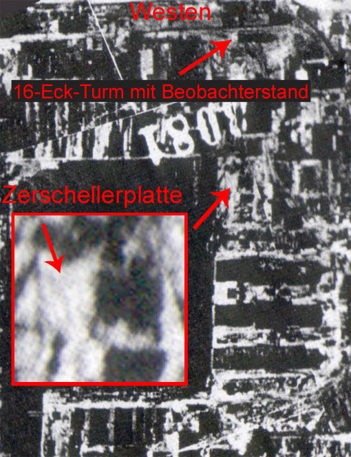 Auf dem Luftbild ist ein sehr wahrscheinlich runder kleiner Luftschutzturm oder Rundbunker / Rundturm mit Spitzkuppel zu erkennen. Er verfügte über eine Zerschellerplatte. Über die Höhe und Art des Turmes kann nichts ausgesagt werden. Der Schatten bricht sich am nahestehenden Gebäude rechts des Turmes.