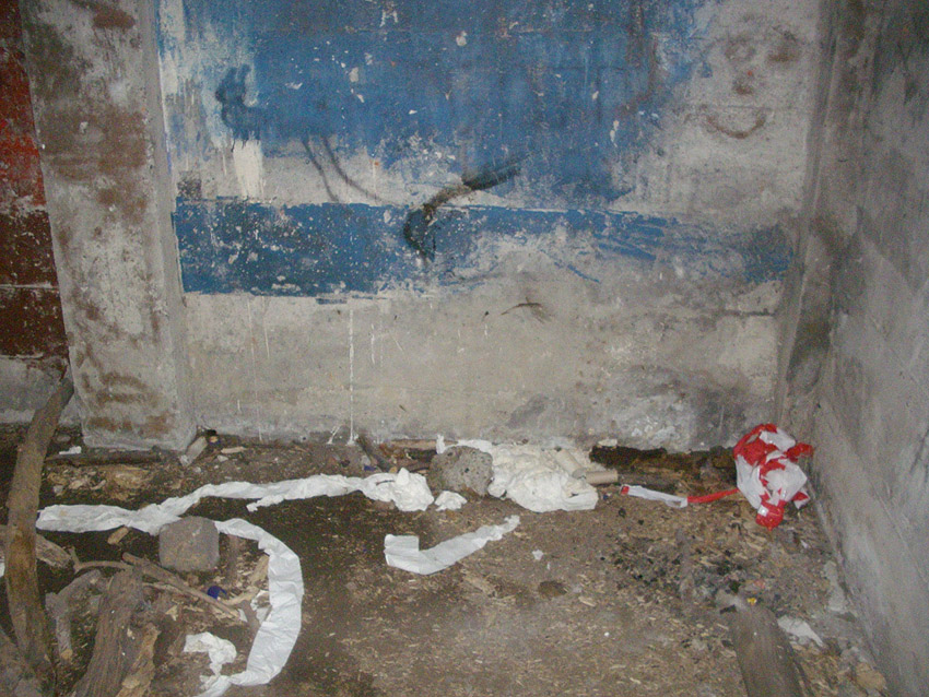 Barackenfundamente und Trümmer: