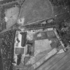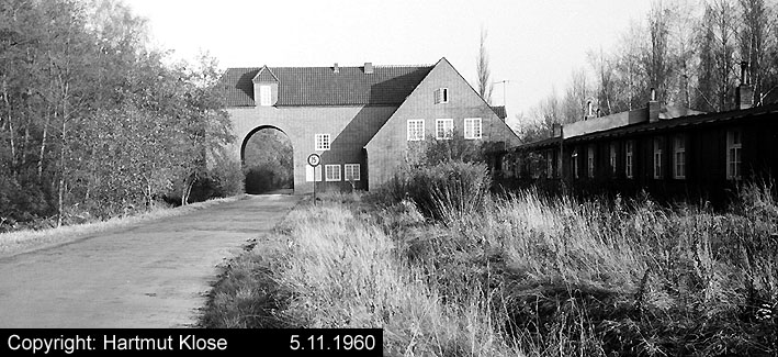 Dieses Bild zeigt den getarnten und verklinkerten Bunker Rosenhügel zwischen 1941 und 1945. Erkennbar ist der nach dem Krieg gesprengte Bereich des Beobachterturmes mit leichter Flakstellung, aufgenommen vom Torbogen des Eingangsbauwerkes zur Flakleitstelle.