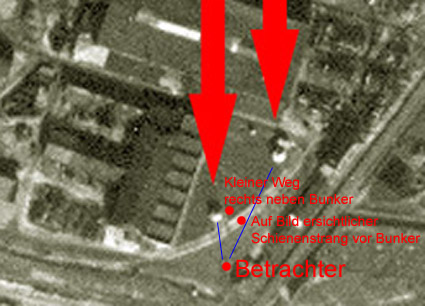 Montage zweier Aufnahmen. Links Bunker 5, rechts Bunker 6, ganz hinten rechts die Kuppel von Bunker 7. Im Rasen ist der zum Zeitpunkt der Aufnahme noch überwachsene Schienenstrang erkennbar. Das Gitter am Eingang des linken Bunkers könnte nachträglich angebracht worden sein. Normalerweise befand sich dort eine Druckschutztür. Zu erkennen ist, dass der Rundbunker in den Jahren stark einseitig versackt war.