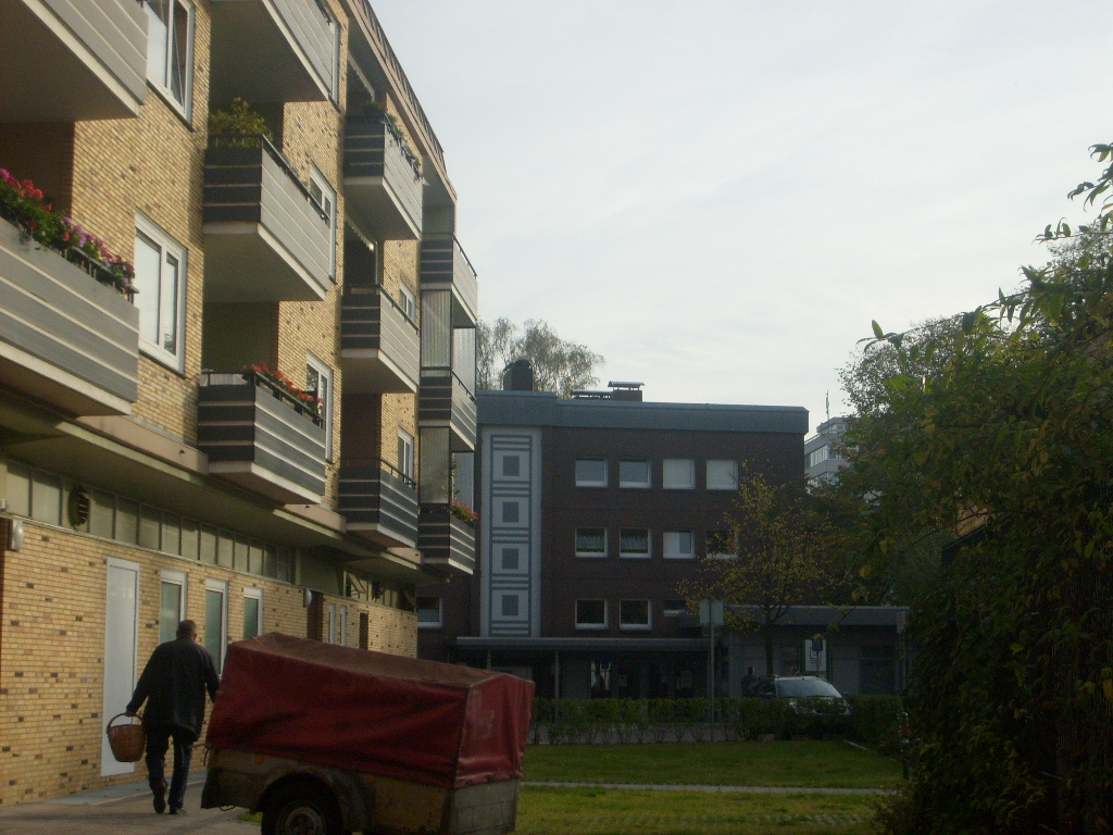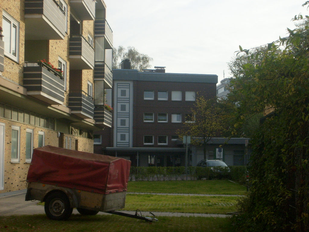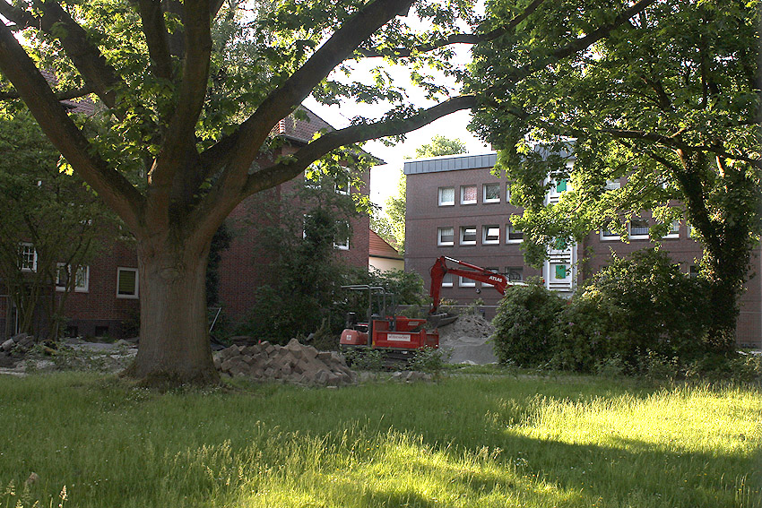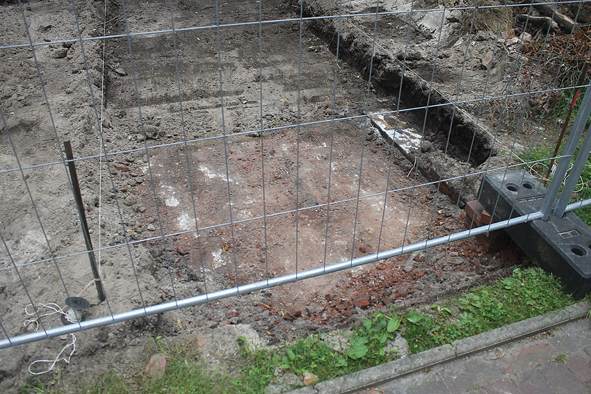 Anfang Juli 2018: Noch immer Bauarbeiten auf dem Platz südlich des ehemaligen Bunkers. Die Zerschellerplatte, die der heute als Wohnhaus und "Treff auf Siebethsburg" genutzte damalige Bunker noch besitzt, ist nun doch im Südbereich ein kleines Stück kurzzeitig wieder ans Tageslicht getreten (vorderer, vom Bagger angekratzter Betonbereich). Die Platte wird auf jeweils etwa 7 Meter Länge vom Bunker-Gebäudekörper ausgehend geschätzt.