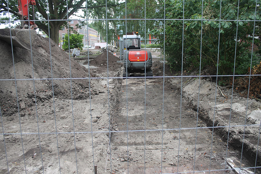 Bauarbeiten auf dem Platz südlich des ehemaligen Bunkers im Mai 2018. Die Zerschellerplatte, die der Bau noch besitzt, ist dabei aber nicht wieder zu Tage getreten: