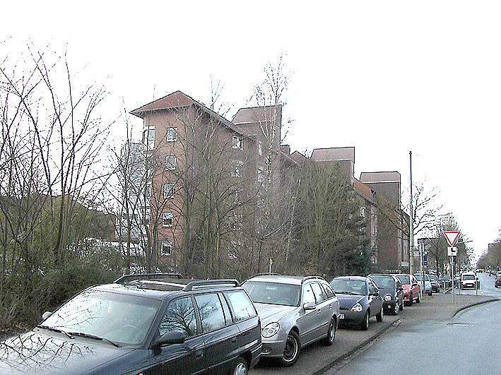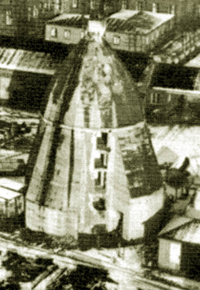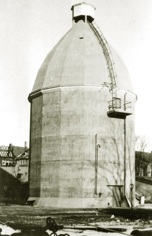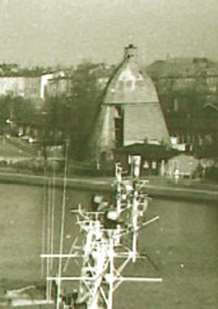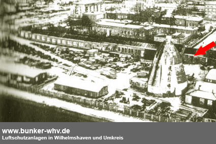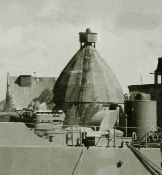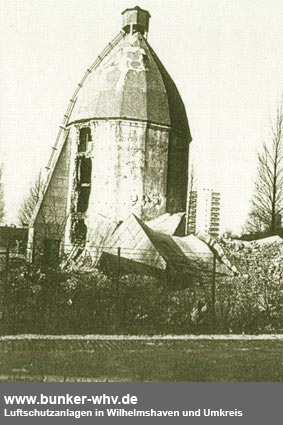Eine Aufnahme aus frühen Kriegstagen, noch ohne später angebrachte Wandverstärkungen und ohne abgeschrägte Splitterschutzeingangsvorbauten wie auf den obig abgebildeten Aufnahmen. Interessanterweise ist der Turm zusammen mit dem bauartgleichen Bunker auf der ehemaligen Kriegsmarinewerft / Ostkaje (dieser ohne Verstärkungen) von der Grundform her ebenso sechzehneckig wie die bekannte 10er-16-Eck-LS-Turmserie Wilhelmshavens. Interessant ist der Ausstieg an der Bunkerwand in Ebene 5. Von hier aus konnte der auf den Turm gesetzte Beobachtungsstand mit integrierter Metallsplitterschutzzelle (andere Quellen bezeichnen ihn auch als Scheinwerferstand) über eine Steigleiter betreten werden. Im Zuge der späteren Verstärkung des Turmes wurde die Öffnung verschlossen und die Steigleiter hatte ihren Beginn am verbreiterten Turmsockel. Der hier abgebildete Turm wurde nach dem Krieg ansatzweise entfestigt (auf einigen der oberen Bilder zu erkennen) und 1975 abgebrochen.