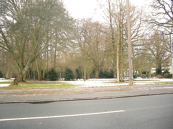 Der Standort heute. Links zu sehen das abgezäunte Gelände des späteren Nachkriegs-Tiefbrunnens Nr. 3... Der Brunnenschacht / Anschluss wird im Krieg zum Inneren des Turmes in dessen Westwand hinein fortgeführt haben.