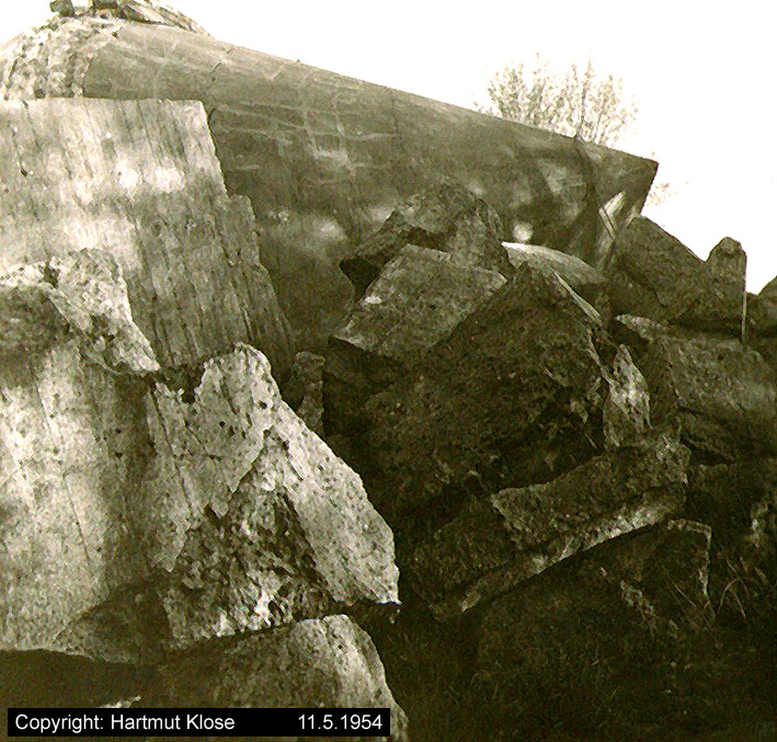 Wohl 1949 kurz vor der Sprengung / Sandsäcke vor dem unteren Eingang zur Druckbrechung und wohl zur Verhinderung von Wasseraustritt ("Wassersprengung")... Der Bunker wurde 1949, wie sein Zwilling westlich - eventuell sogar am gleichen Tag wie dieser (2. November 1949) - gesprengt.