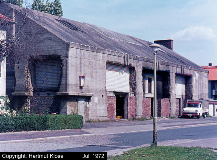 Aufnahme des Hochbunkers Am Bahnhof. Der Bunker ist im zum Wohnhaus umgebauten Zustand vorhanden. Aufnahme aus dem Jahre 1972.