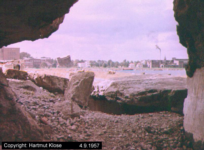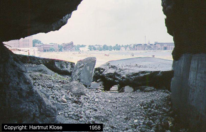 Aufnahmen aus dem gesprengten Artilleriebunker hinaus auf das ehemalige Bauwerftgelände. Im Hintergrund zu erkennen der ebenfalls gesprengte Befehlsbunker. Beide Bunker wurden entfernt. Heute ist dies der Standort des Marinearsenals. Aufnahmen aus den Jahren 1957 und 1958.