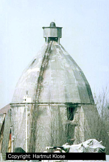Die links ersichtliche Schutzzelle ist eine Metallsplitterschutzzelle der Bauart "Mannesmann". Diese Zelle war mit ziemlicher Sicherheit ursprünglich oben auf der Kuppel eingebettet in den Beobachtungsstand des LS-Turmes (siehe Aufnahmen des intakten Turmes).
