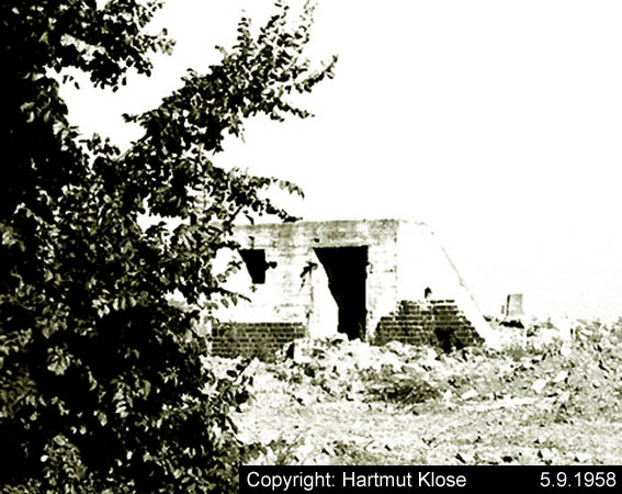 Aufnahmen des Kleinbunkers der E-Werkstatt Süd nahe des Artilleriebunkers der Bauwerft (oben im Hintergrund). Der Bunker wurde, wie auch der Artilleriebunker, später beseitigt. Aufnahmen aus dem Jahre 1958.