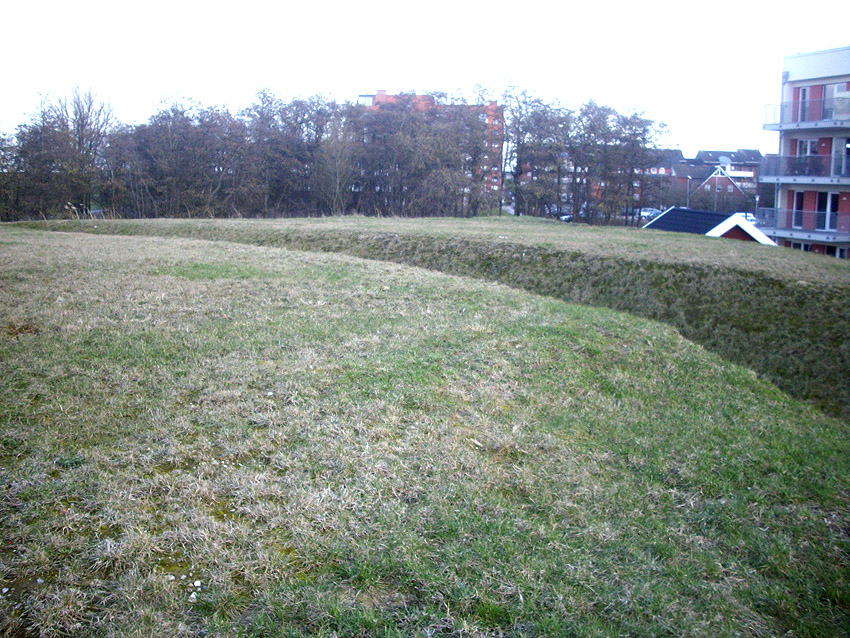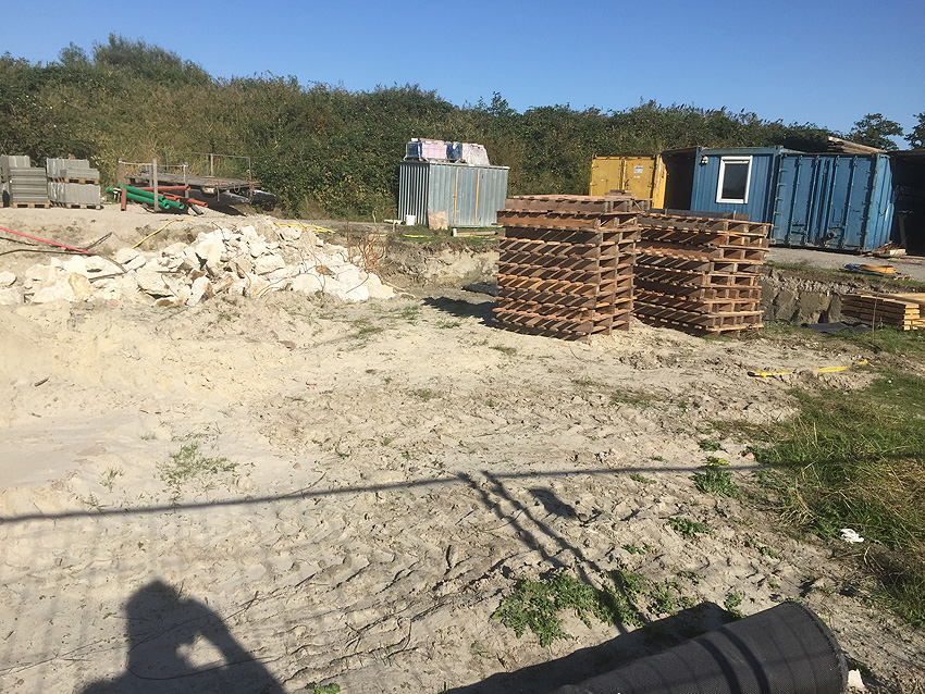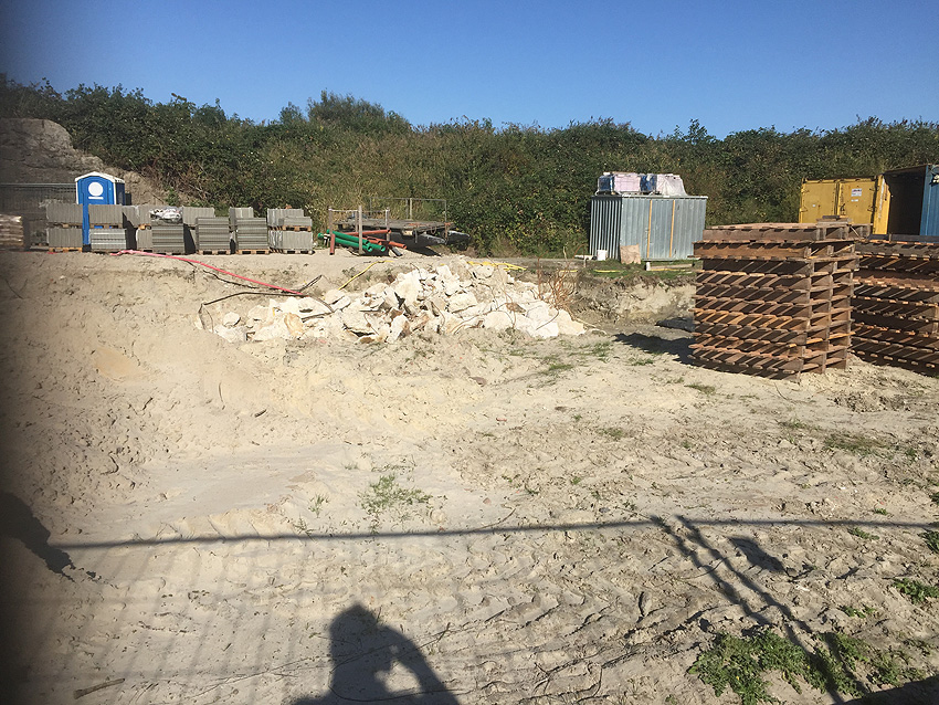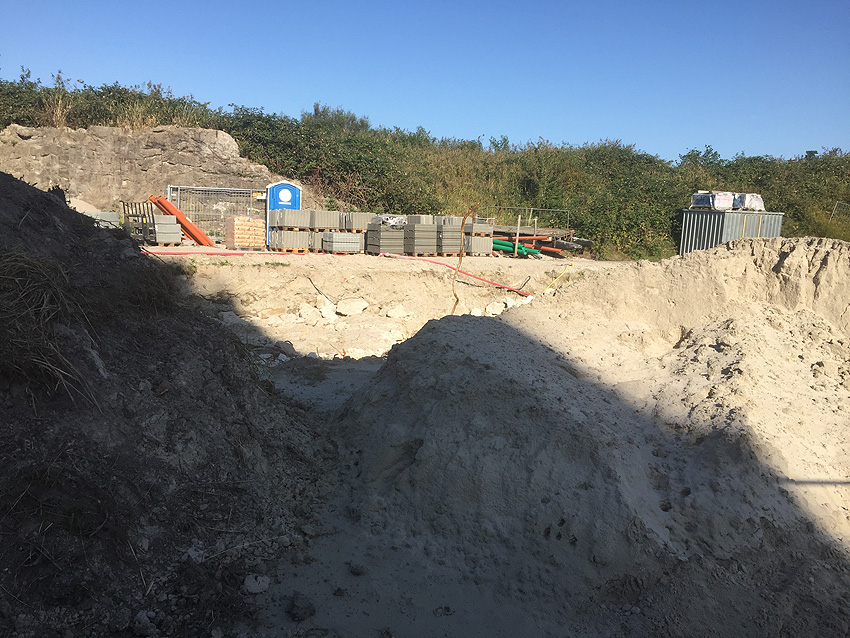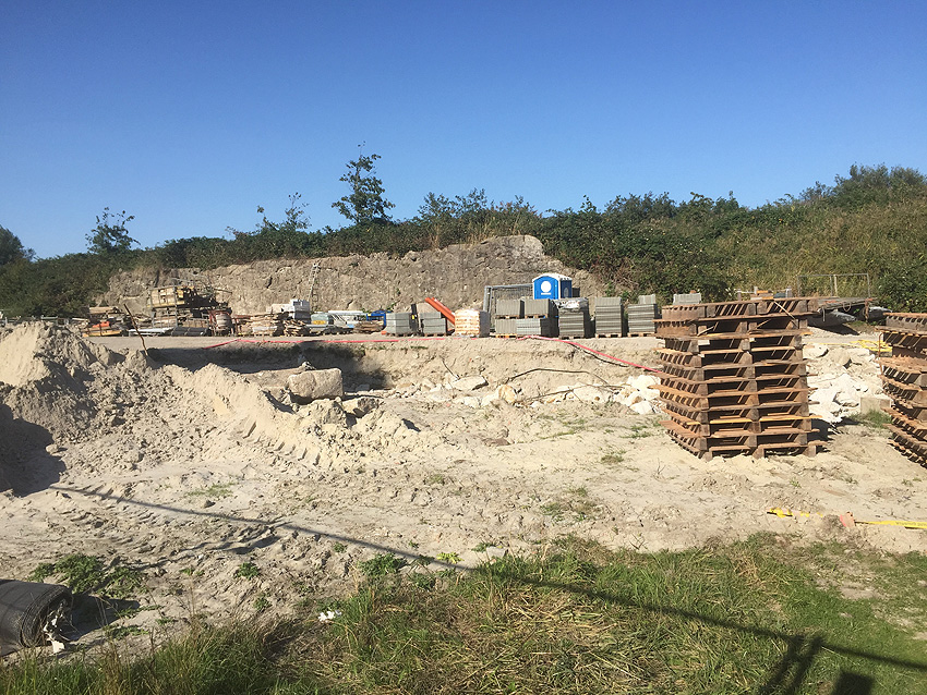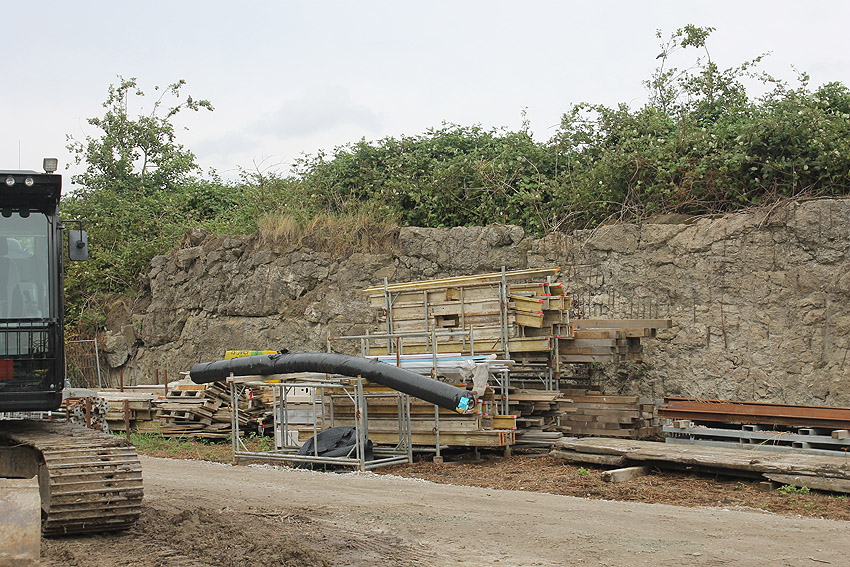 Der Aushub für zwei Neubauten wird getätigt. Hierbei traten alte Begrenzungspfähle und wohl das Fundament der historischen, ursprünglichen 28 cm-Geschützbettung Ost, eine von vier gewaltigen Bettungen, ans Tageslicht. Diverse weitere Trümmer und anderweitige Relikte wurden aufgefunden. Das ans Licht getretene Fundament (wohl) der Bettung soll massive 1,20 Meter stark sein. Dies ergaben Kernbohrungen. Auch soll in dem Bereich noch immer eine Art Gang in Richtung Süden in Richtung Umlaufgraben vorhanden sein. Wir berichten weiter.