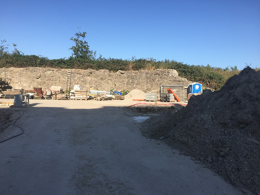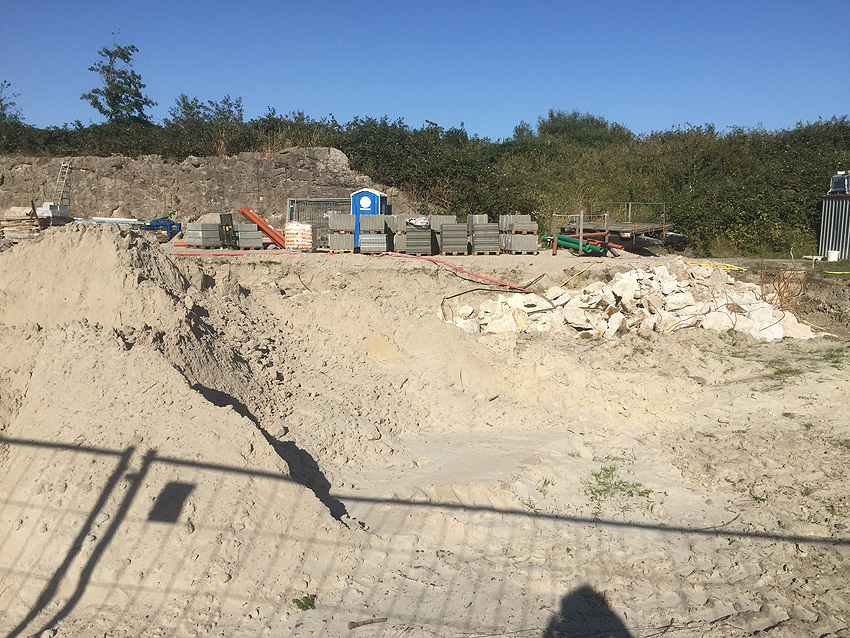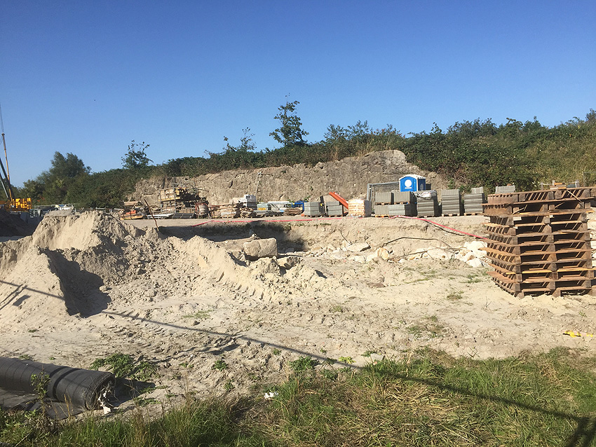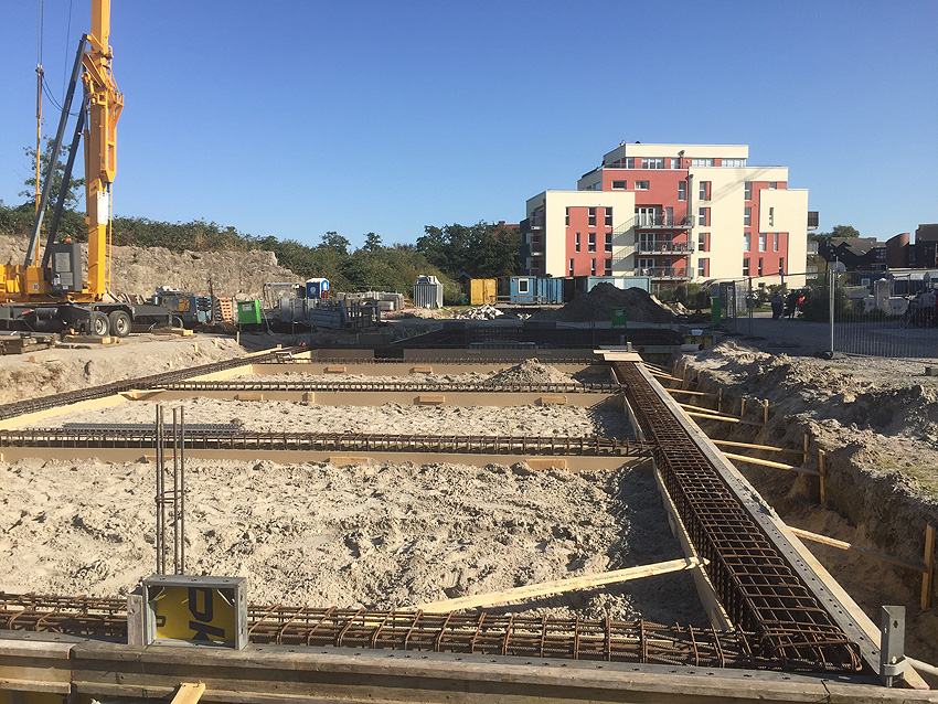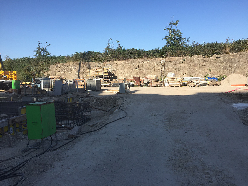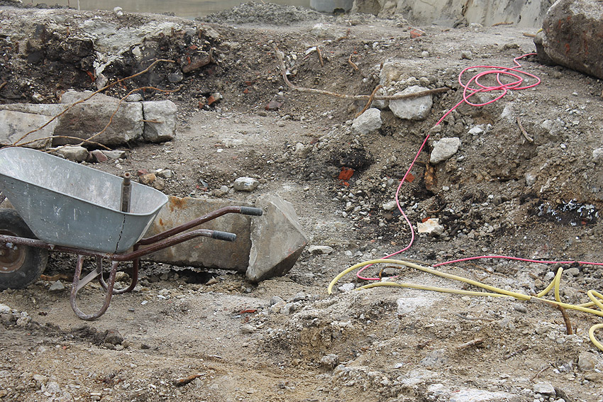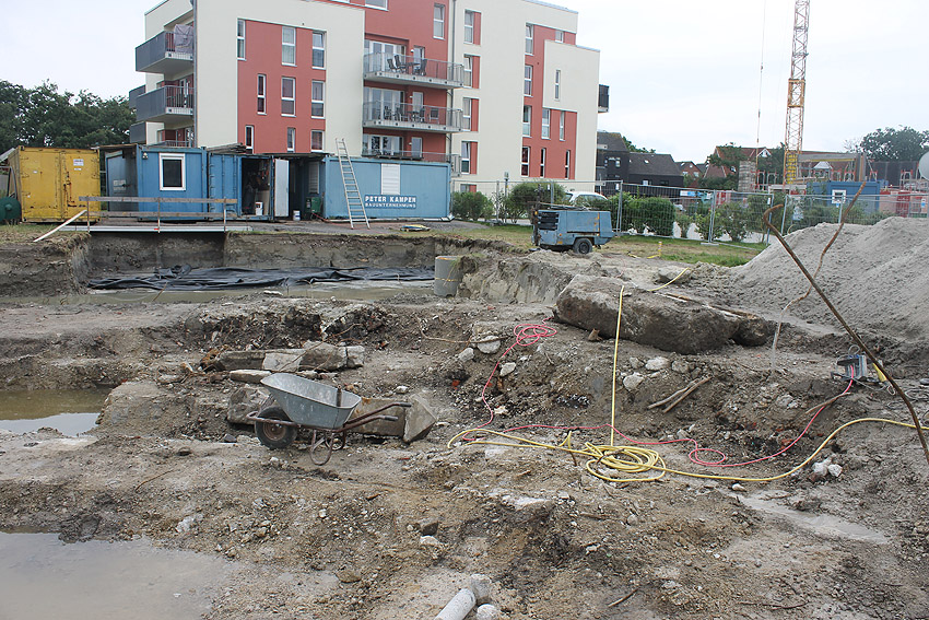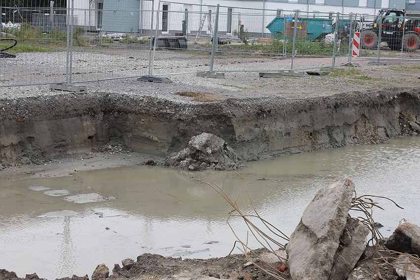 Die Betonstrukturen im Baustellenbereich sind größtenteils beseitigt worden. Weitere Strukturen als die ersichtlichen sind nicht mehr ans Tageslicht getreten. Nun erfolgt die Tiefgründung des Neubaues.